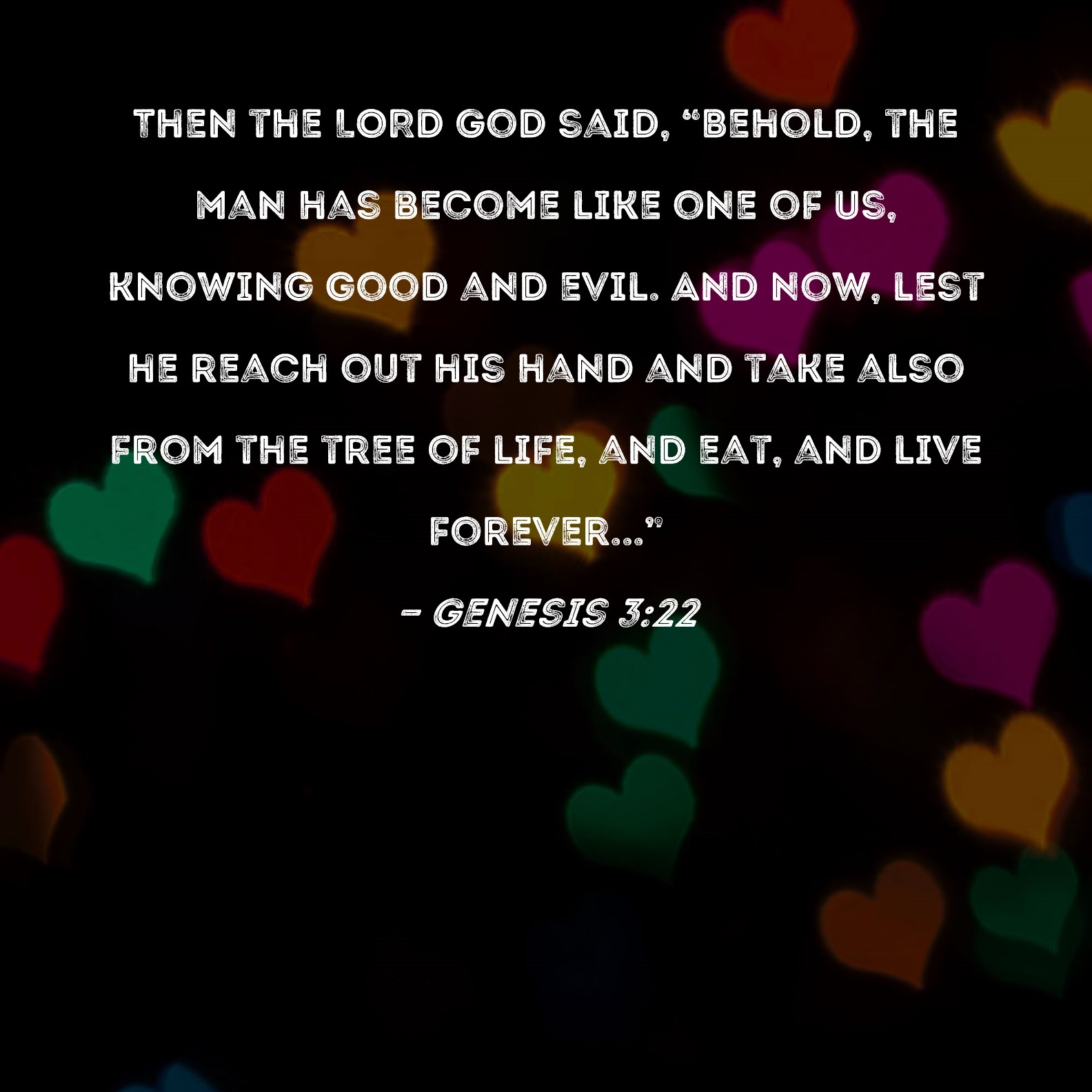 Genesis 3:22 Then the LORD God said, "Behold, the man has become like one of Us, knowing good and evil. And now, lest he reach out his hand and take also from the tree of life, and eat, and live forever..."