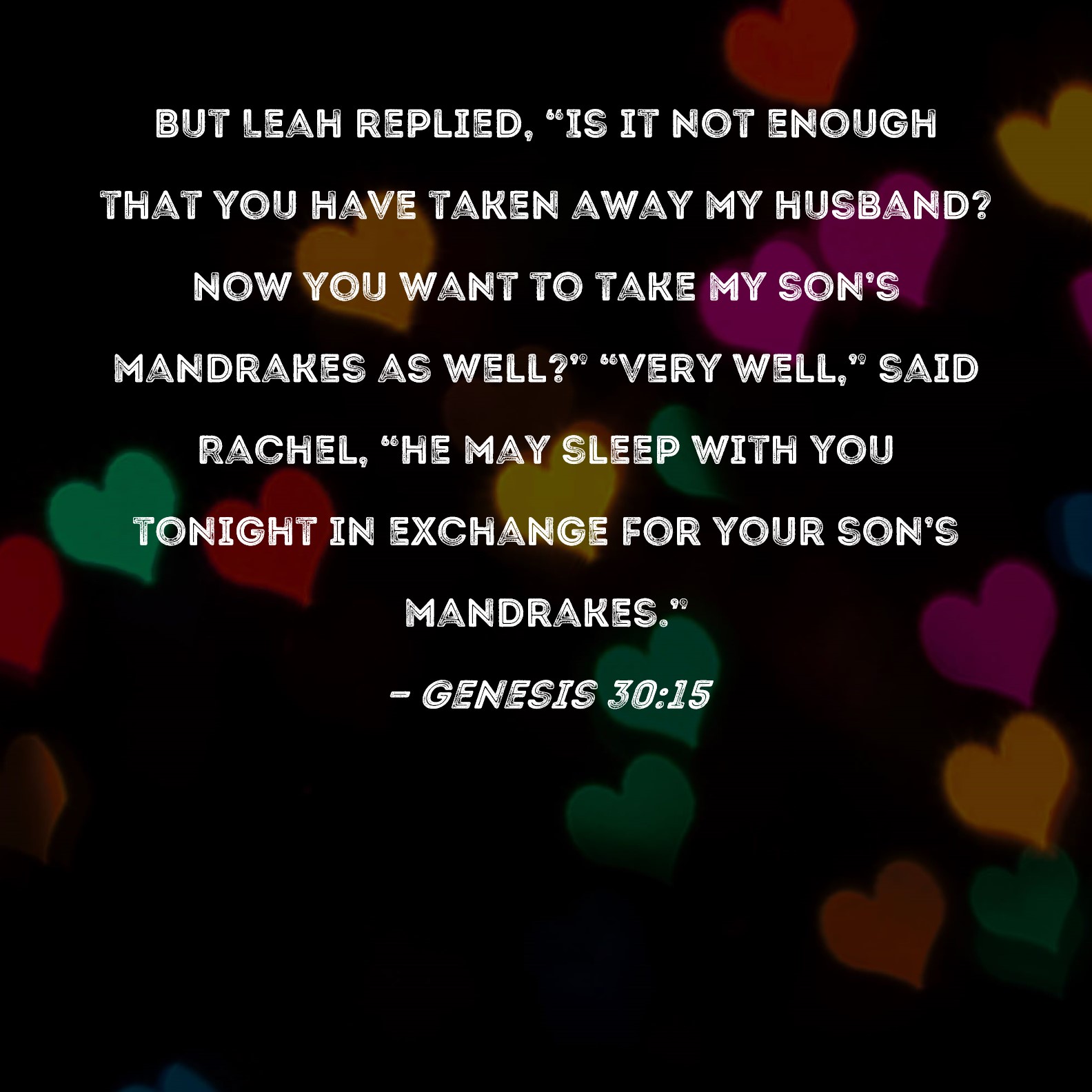 Genesis 30:15 But Leah replied, "Is it not enough that you have taken away my husband? Now you want to take my son's mandrakes as well?" "Very well," said Rachel, "he may sleep with you tonight in exchange for your son's mandrakes."