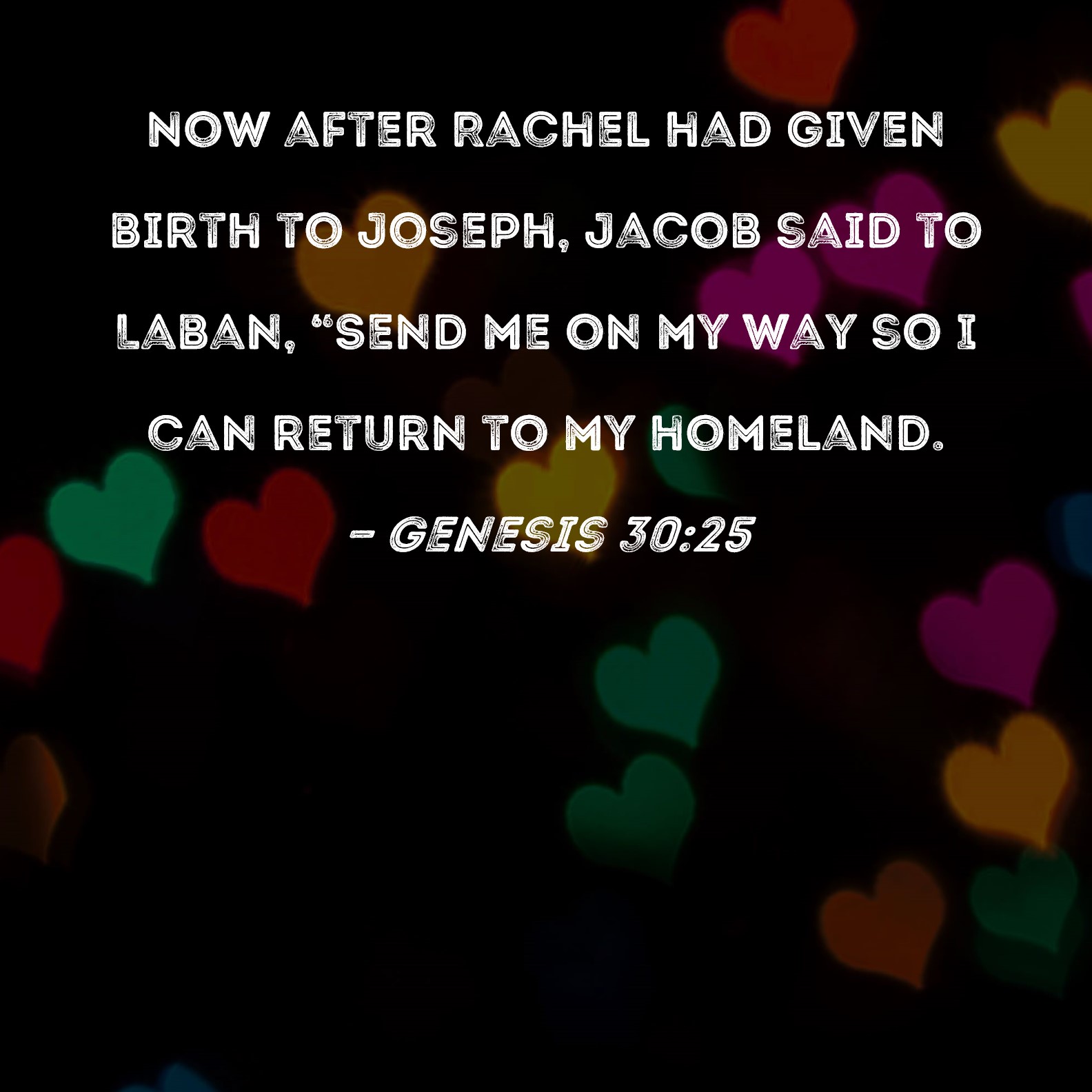 Genesis 30:25 Now after Rachel had given birth to Joseph, Jacob said to Laban, "Send me on my way so I can return to my homeland.