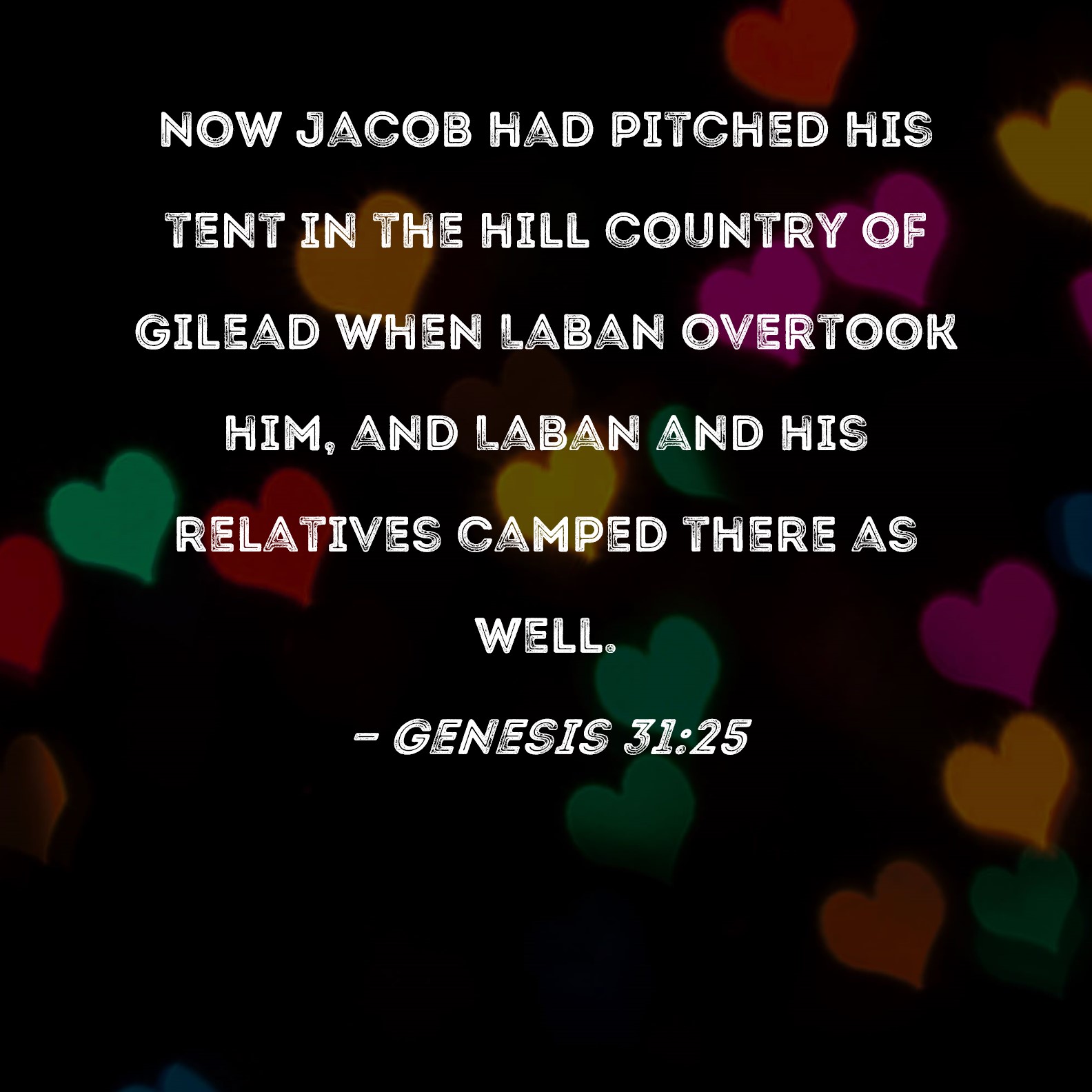 Genesis 31:25 Now Jacob had pitched his tent in the hill country of Gilead when Laban overtook him, and Laban and his relatives camped there as well.