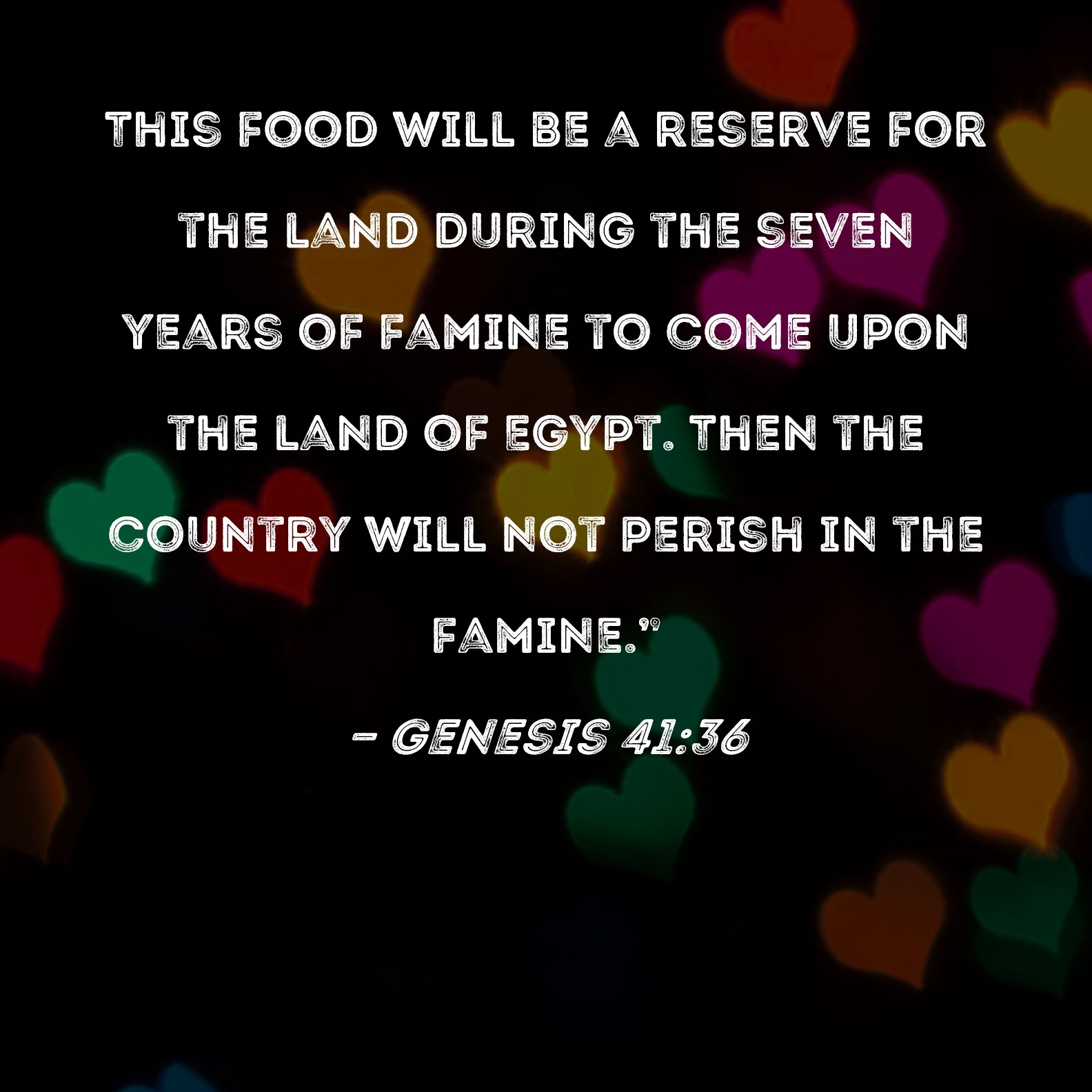 Genesis 41:36 This food will be a reserve for the land during the seven years of famine to come upon the land of Egypt. Then the country will not perish in the famine."