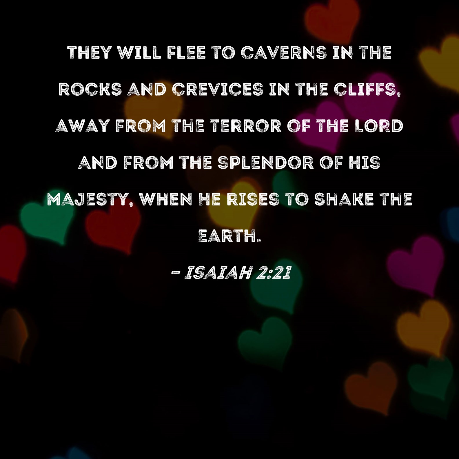 Isaiah 2:21 They will flee to caverns in the rocks and crevices in the cliffs, away from the terror of the LORD and from the splendor of His majesty, when He rises to shake the earth.