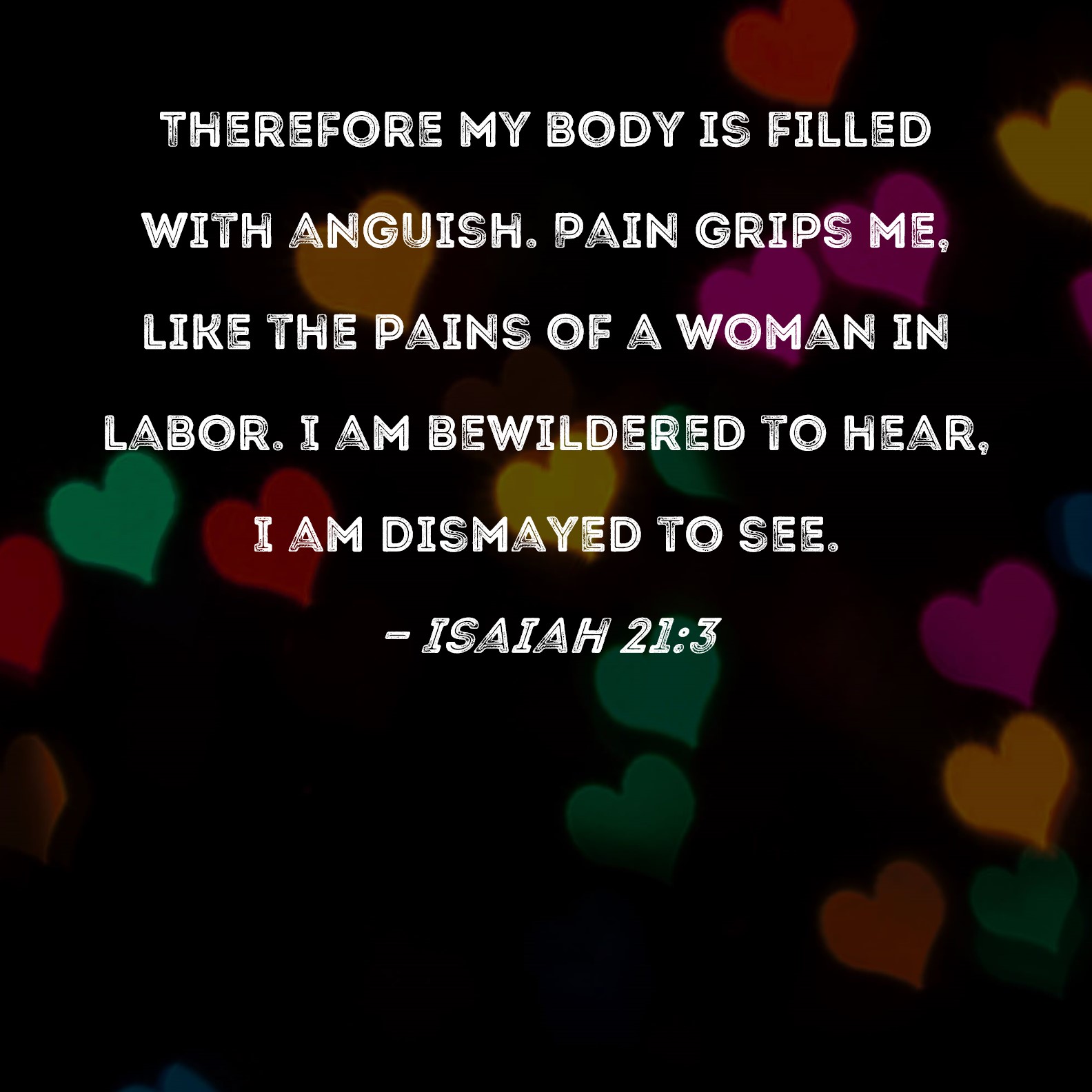 Isaiah 21:3 Therefore my body is filled with anguish. Pain grips me, like the pains of a woman in labor. I am bewildered to hear, I am dismayed to see.