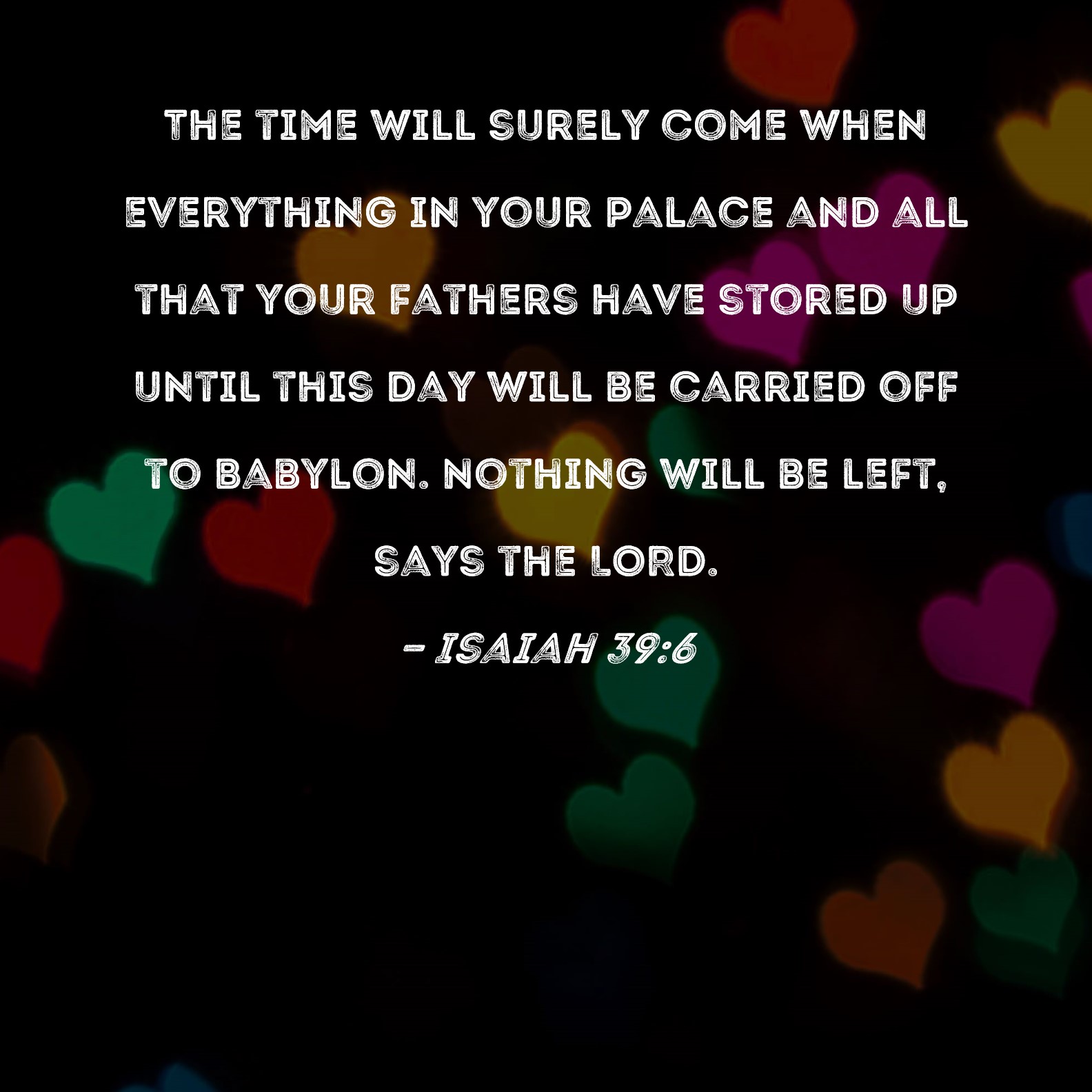 Isaiah 39:6 The time will surely come when everything in your palace and all that your fathers have stored up until this day will be carried off to Babylon. Nothing will be left, says the LORD.