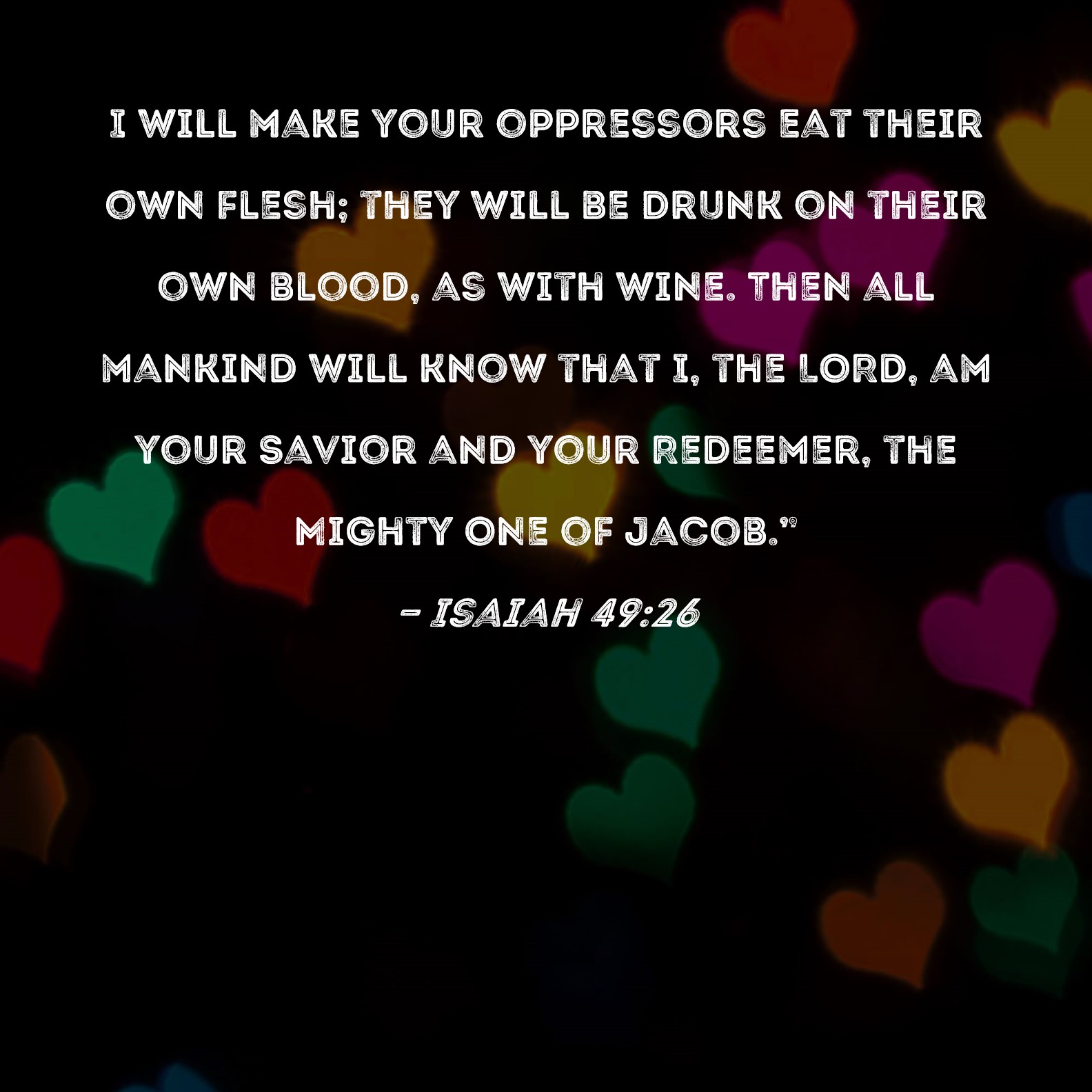 Isaiah 49:26 I will make your oppressors eat their own flesh; they will be drunk on their own blood, as with wine. Then all mankind will know that I, the LORD, am your Savior and your Redeemer, the Mighty One of Jacob."