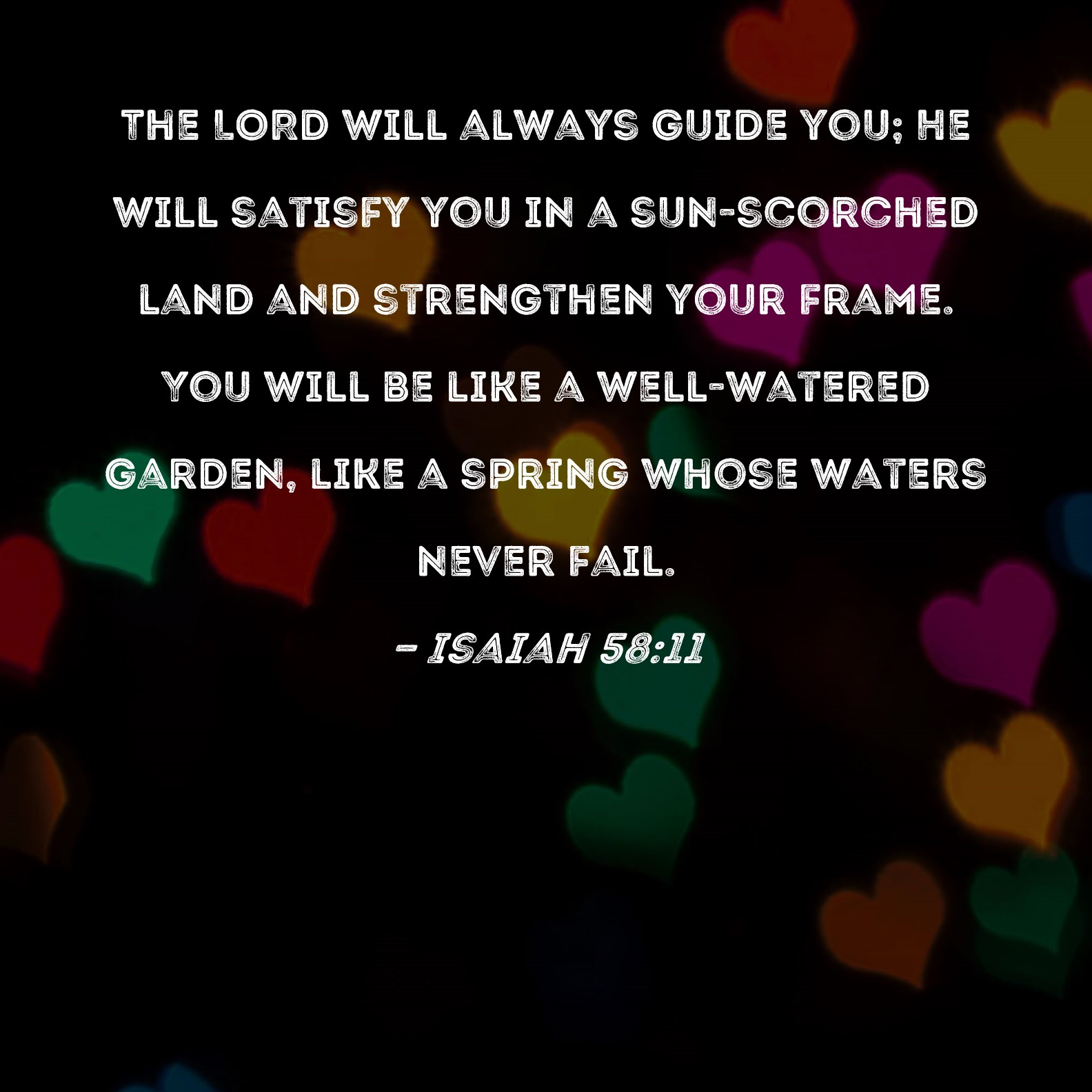 Isaiah 58:11 The LORD will always guide you; He will satisfy you in a sun-scorched land and strengthen your frame. You will be like a well-watered garden, like a spring whose waters never fail.