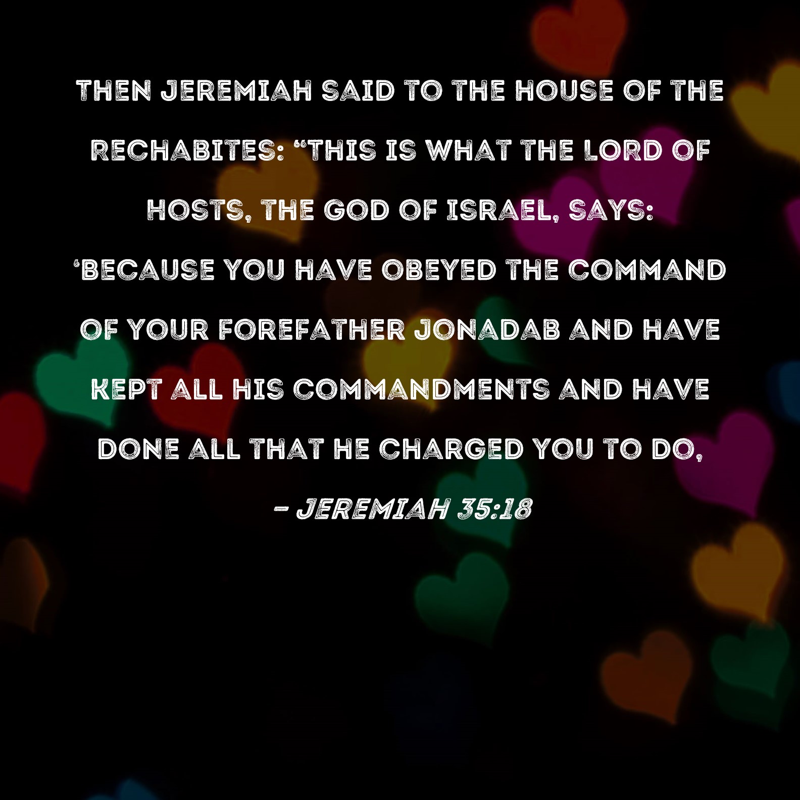 Jeremiah 35:18 Then Jeremiah said to the house of the Rechabites: "This is what the LORD of Hosts, the God of Israel, says: 'Because you have obeyed the command of your forefather Jonadab and have kept all his commandments and have done all that he charged you to do,
