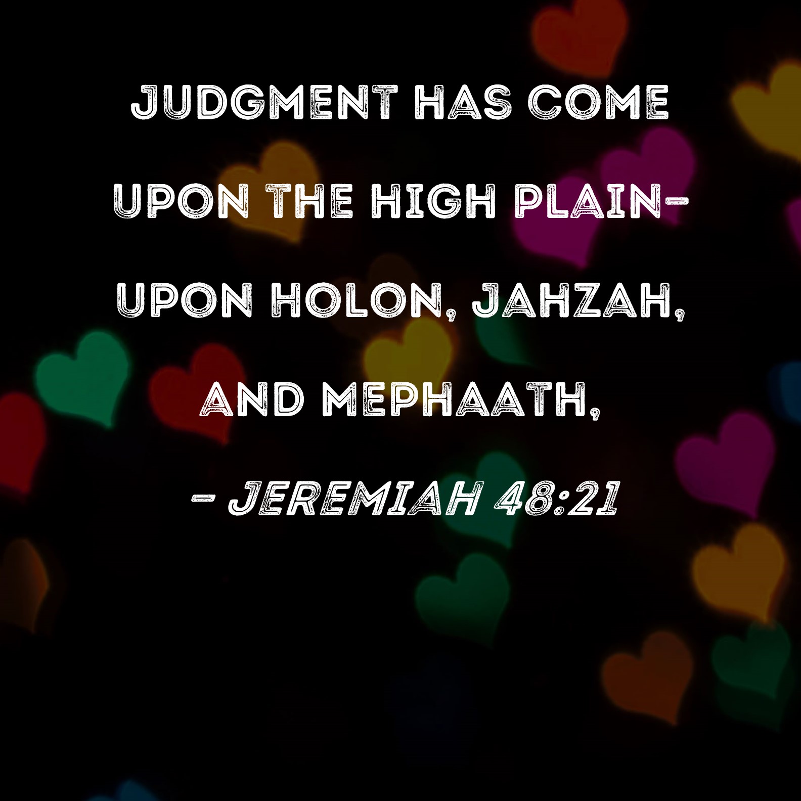 Jeremiah 48:21 Judgment has come upon the high plain--upon Holon, Jahzah, and Mephaath,