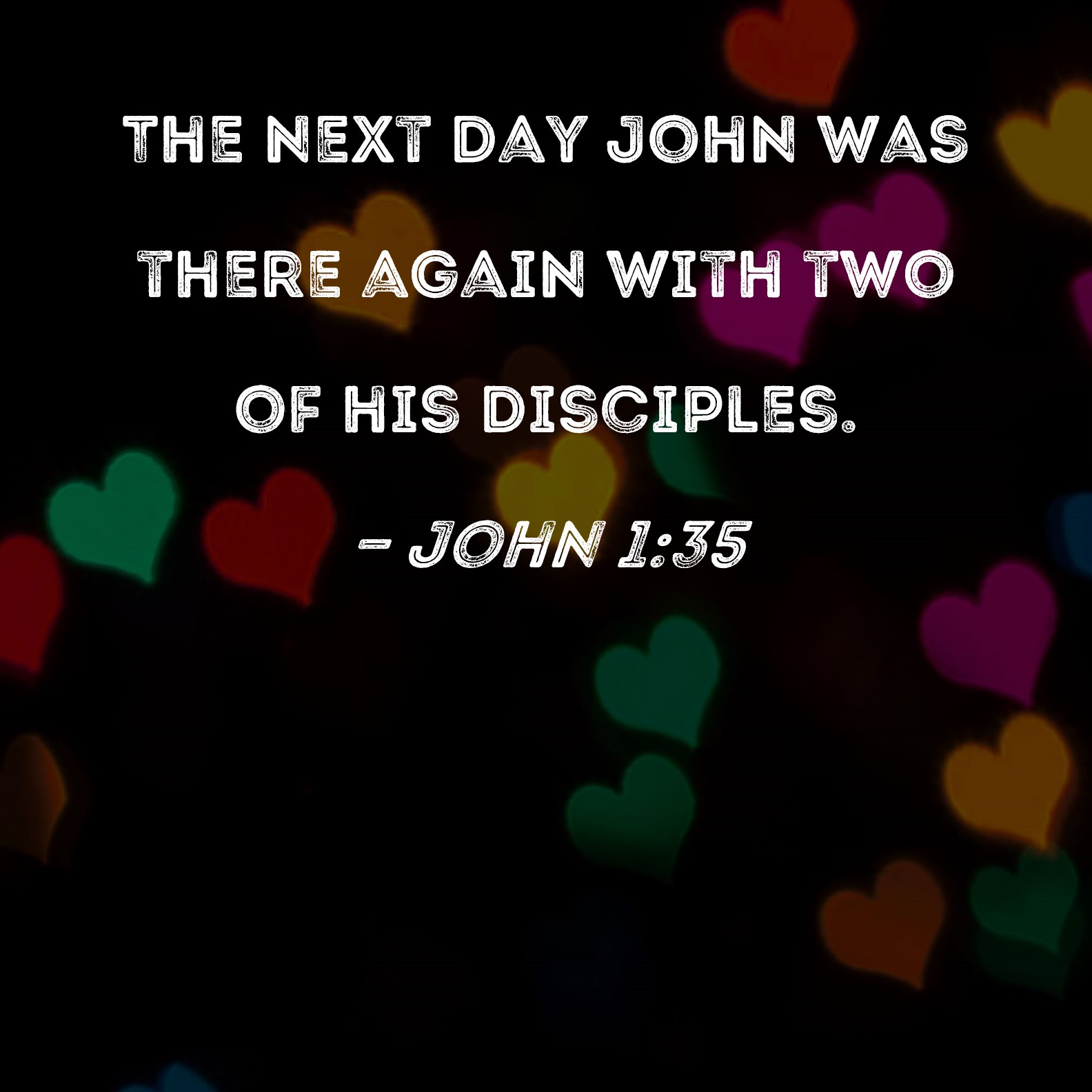 BSB: The next day John was there again with two of his disciples. KJV: Again the next day after John stood, and two of his disciples; DRB: The next day again John stood, and two of his disciples. DBT: Again, on the morrow, there stood John and two of his disciples. ERV: Again on the morrow John was standing, and two of his disciples; WBT: Again the next day after, John stood, and two of his disciples; WEB: Again, the next day, John was standing with two of his disciples, YLT: On the morrow, again, John was standing, and two of his disciples,Links John 1:35 NIV • John 1:35 NLT • John 1:35 ESV • John 1:35 NASB • John 1:35 KJV • John 1:35 Interlinear • John 1:35 Commentaries • John 1:35 Parallel Texts • John 1:35 Bible Apps • John 1:35 Parallel • Bible Hub |