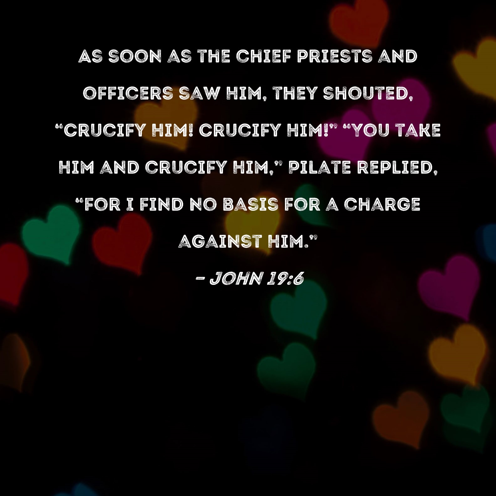 John 19:6 As soon as the chief priests and officers saw Him, they shouted, "Crucify Him! Crucify Him!" "You take Him and crucify Him," Pilate replied, "for I find no basis for a charge against Him."