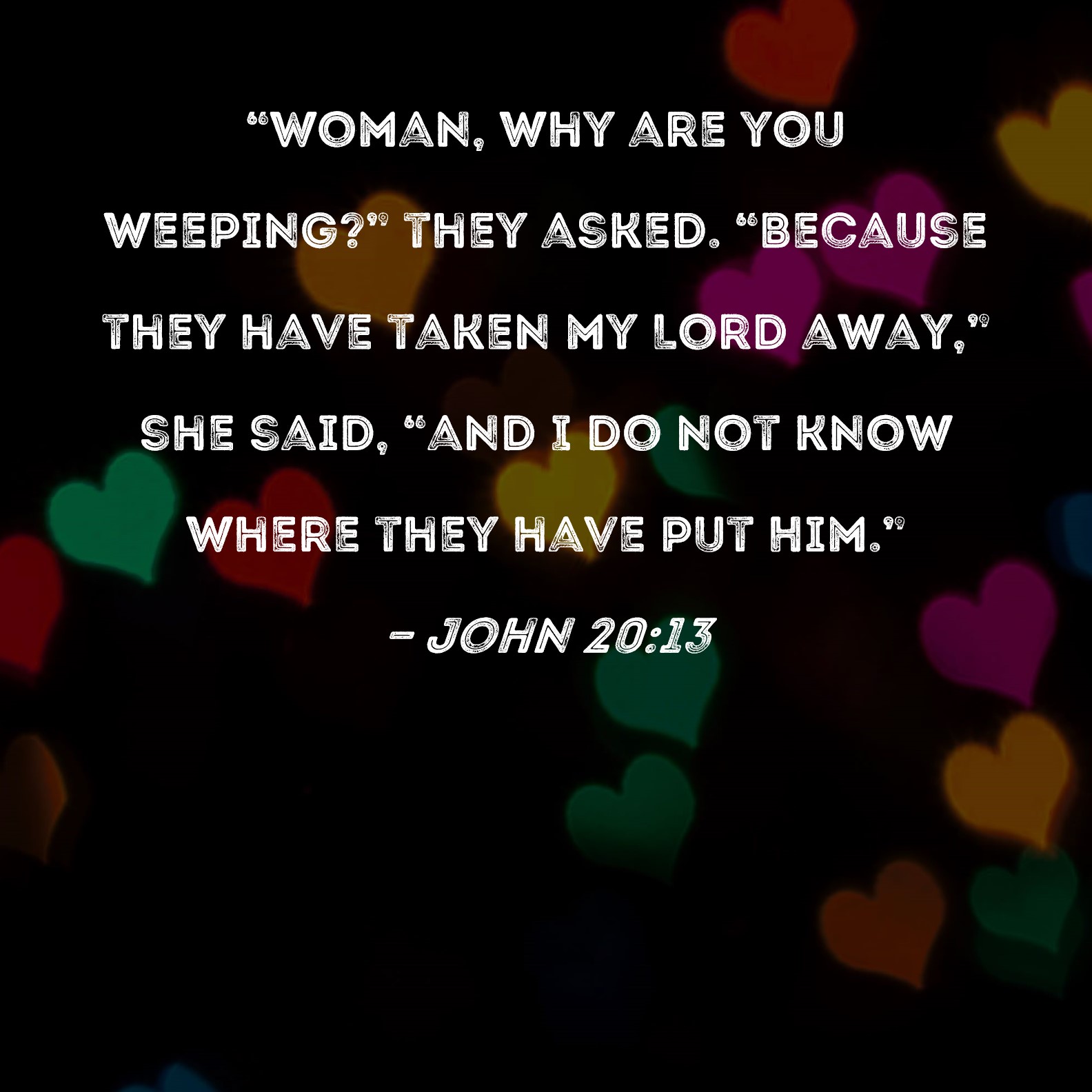 John 20:13 "Woman, why are you weeping?" they asked. "Because they have taken my Lord away," she said, "and I do not know where they have put Him."