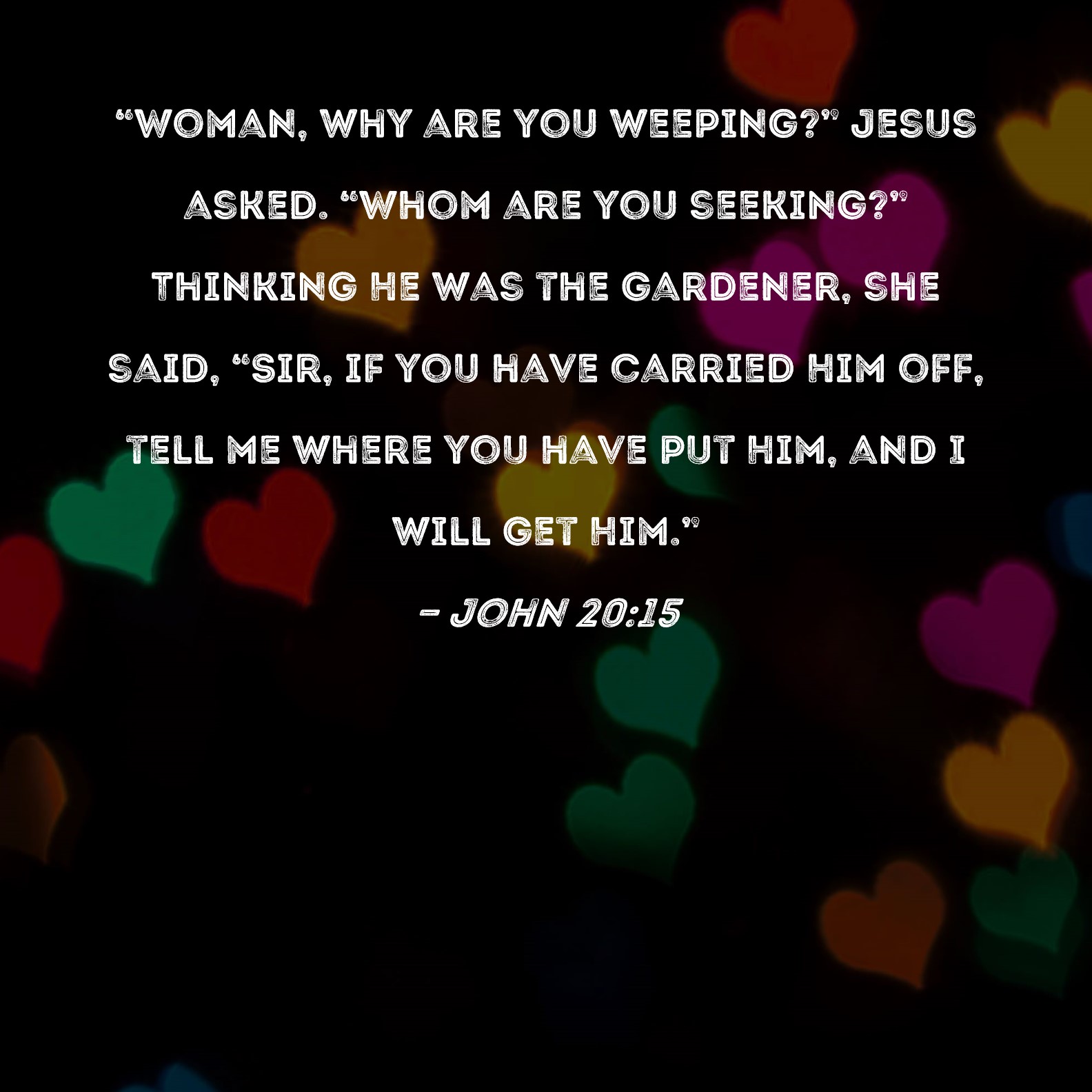 John 20:15 "Woman, why are you weeping?" Jesus asked. "Whom are you seeking?" Thinking He was the gardener, she said, "Sir, if you have carried Him off, tell me where you have put Him, and I will get Him."