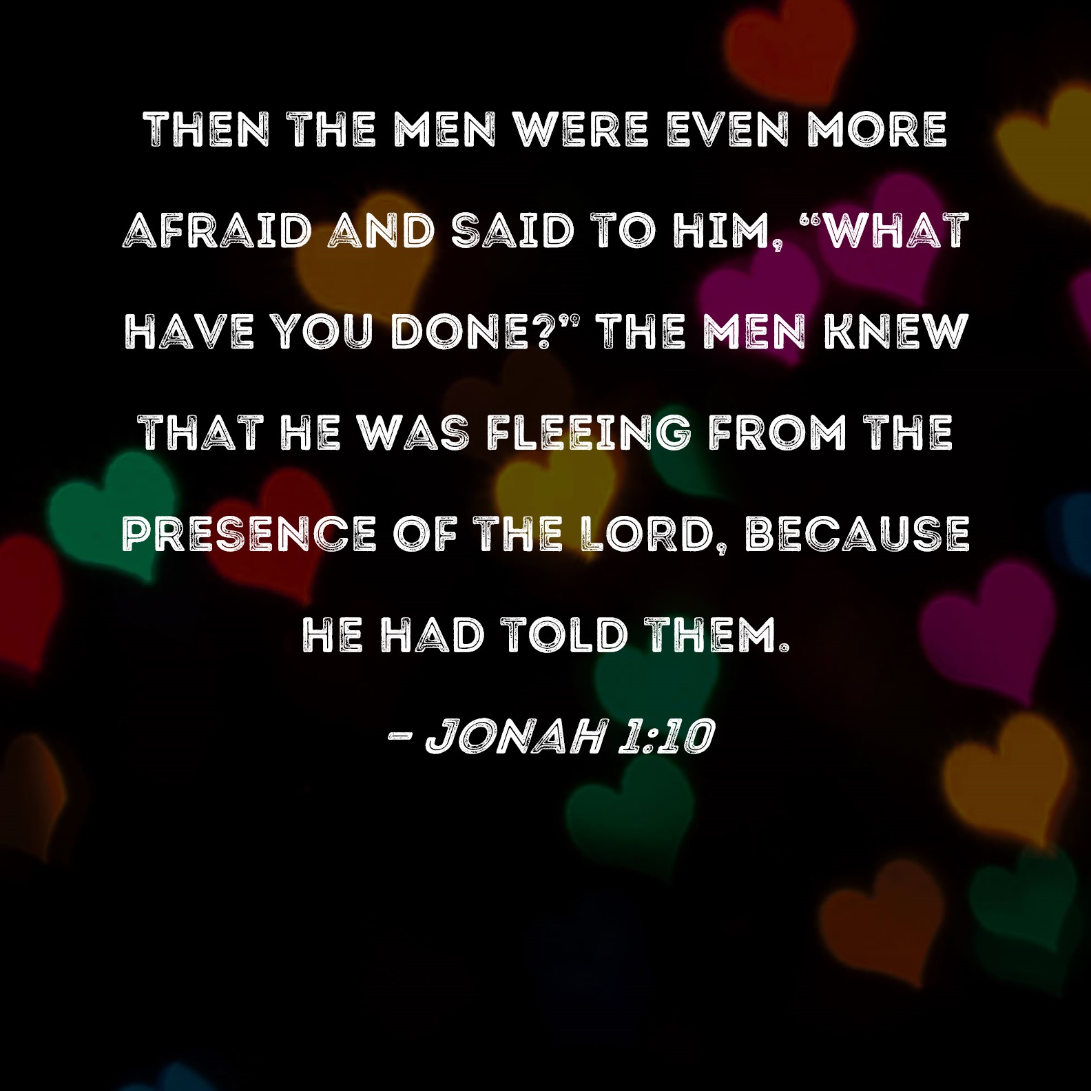 Jonah 1:10 Then the men were even more afraid and said to him, "What have you done?" The men knew that he was fleeing from the presence of the LORD, because he had told them.