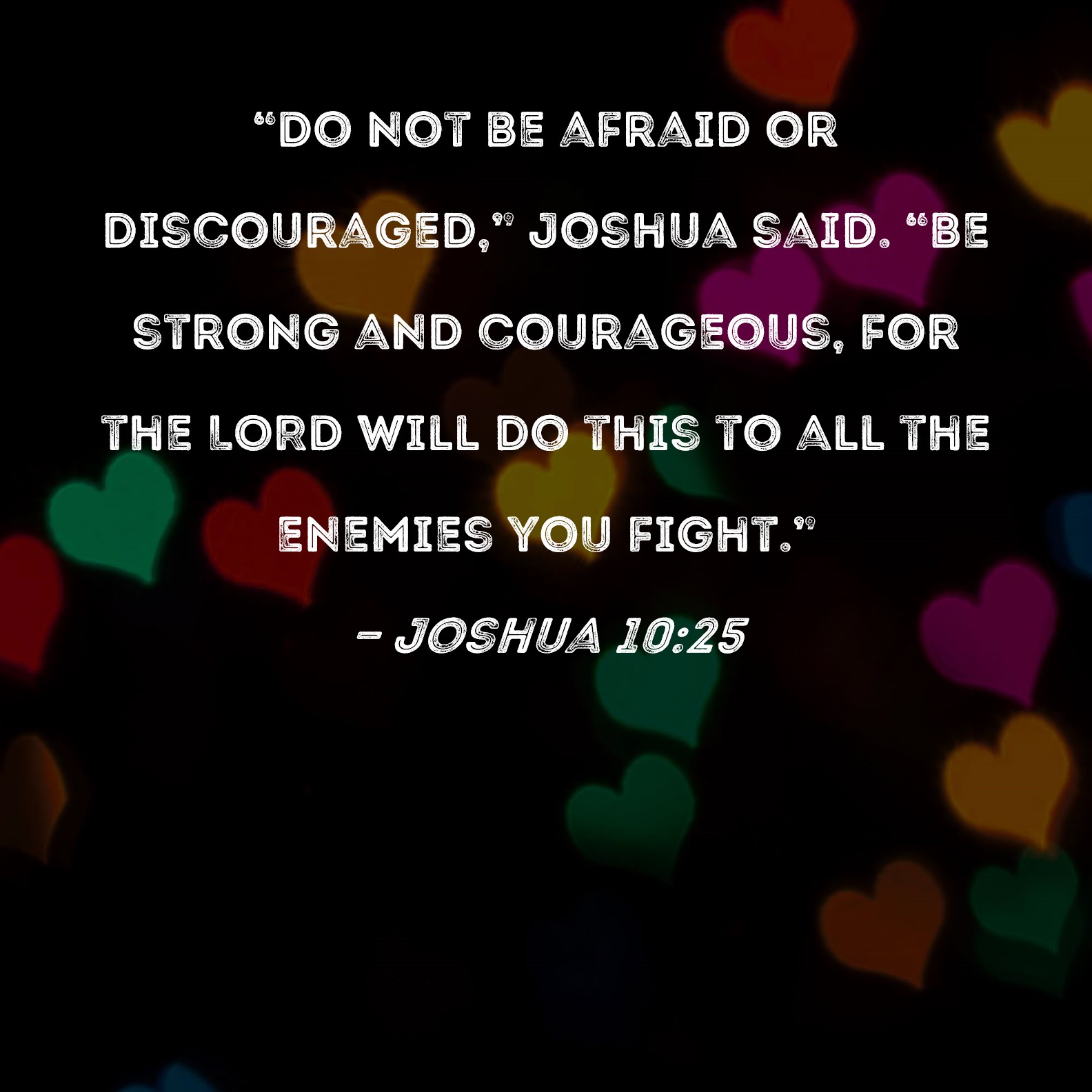 Joshua 10:25 "Do not be afraid or discouraged," Joshua said. "Be strong and courageous, for the LORD will do this to all the enemies you fight."