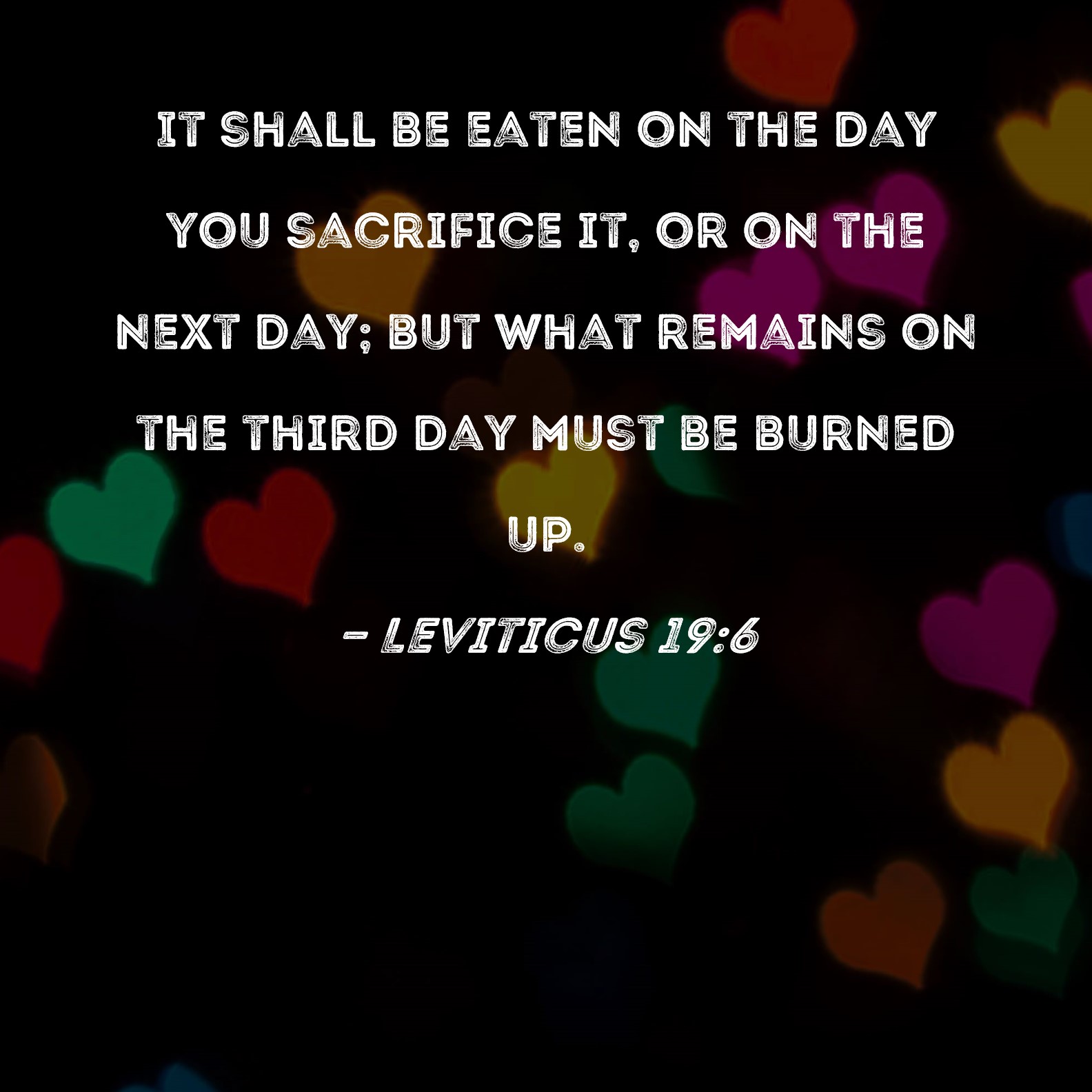 Leviticus 19:6 It shall be eaten on the day you sacrifice it, or on the next day; but what remains on the third day must be burned up.