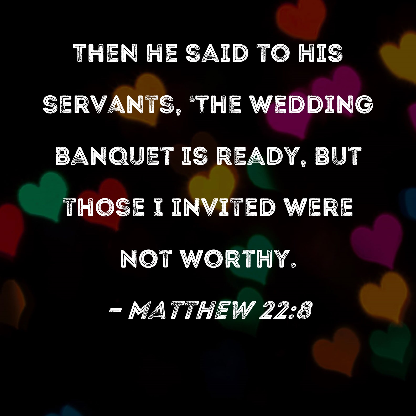 Matthew 22:8 Then he said to his servants, 'The wedding banquet is ready, but those I invited were not worthy.
