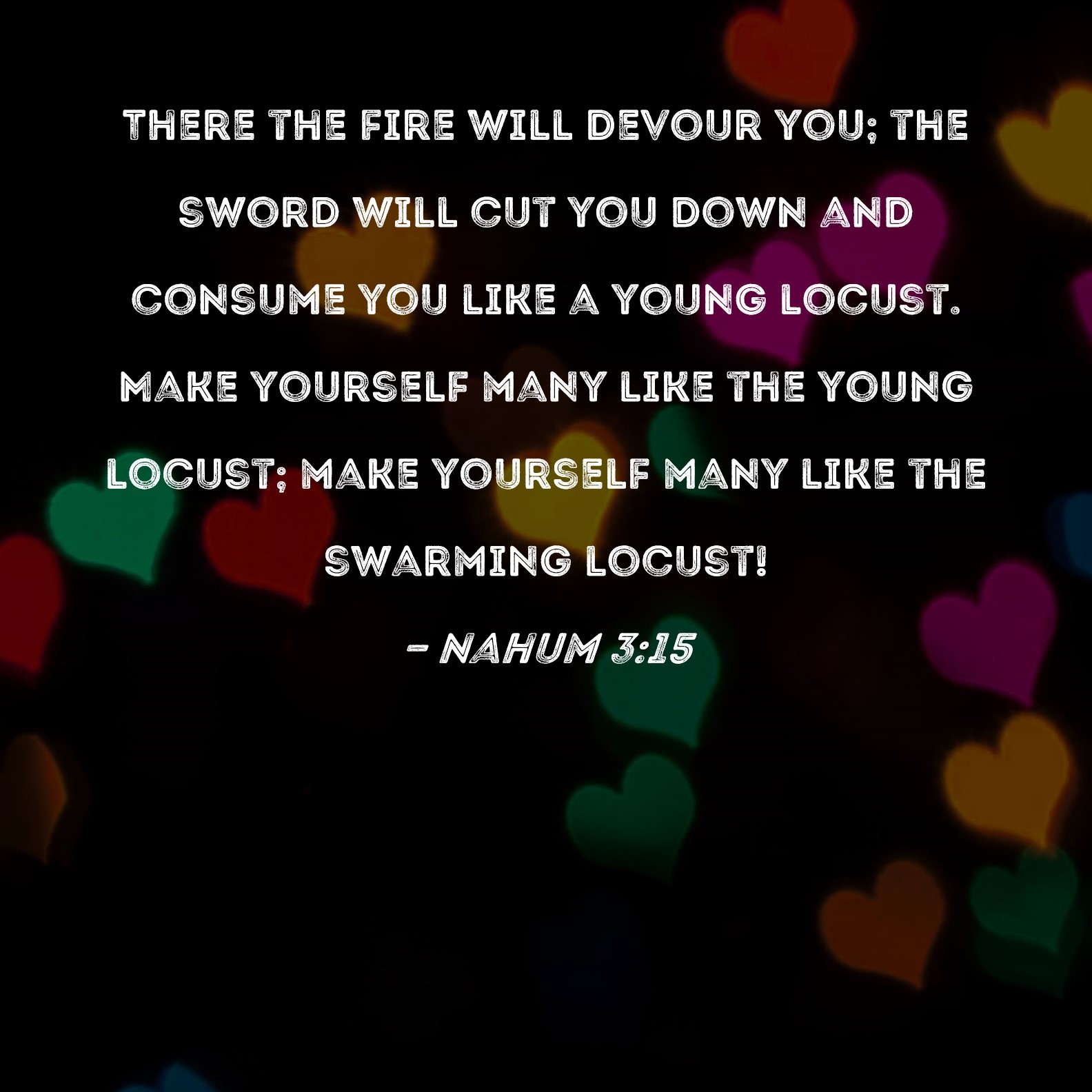 Nahum 3:15 There the fire will devour you; the sword will cut you down and consume you like a young locust. Make yourself many like the young locust; make yourself many like the swarming locust!