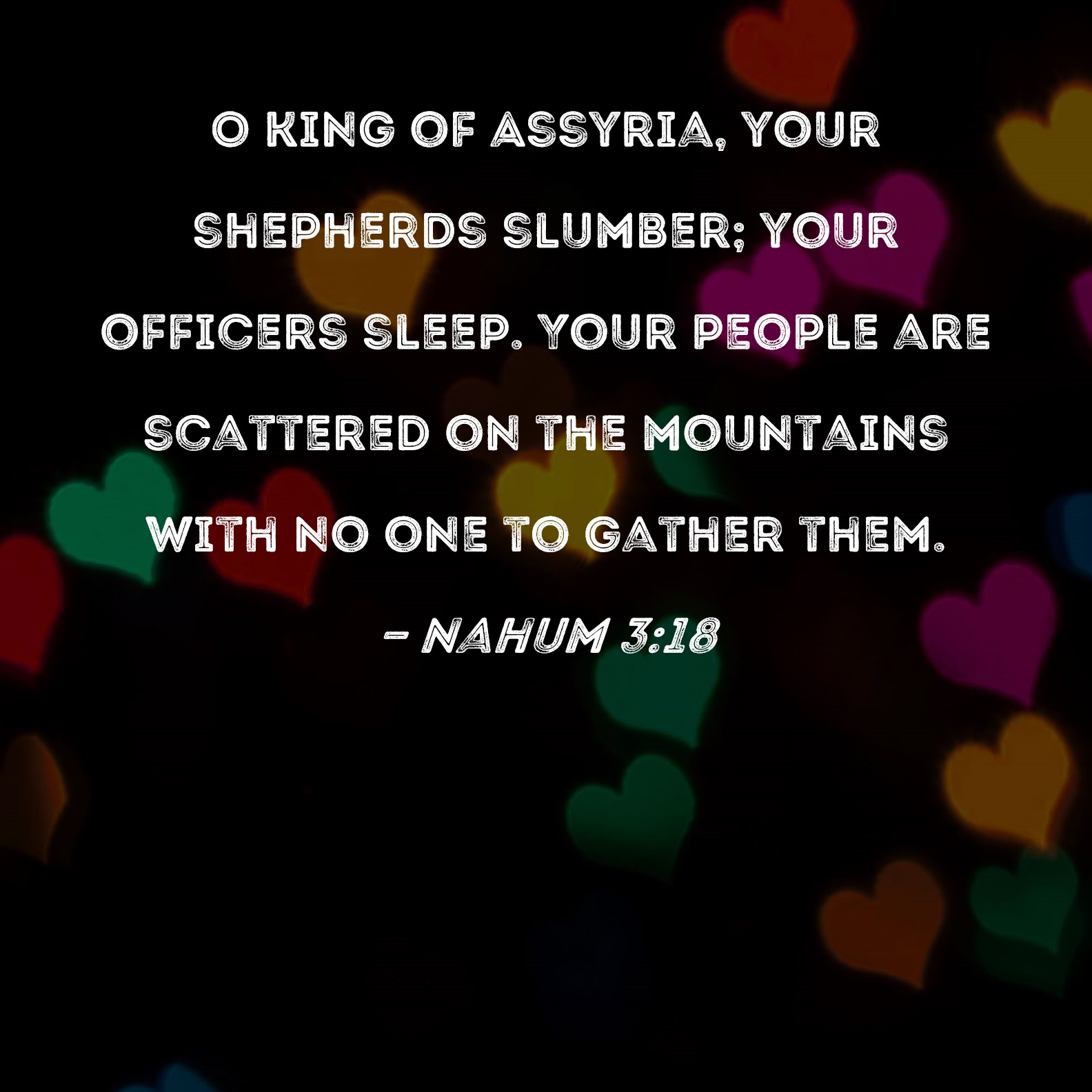 Nahum 3:18 O king of Assyria, your shepherds slumber; your officers sleep. Your people are scattered on the mountains with no one to gather them.