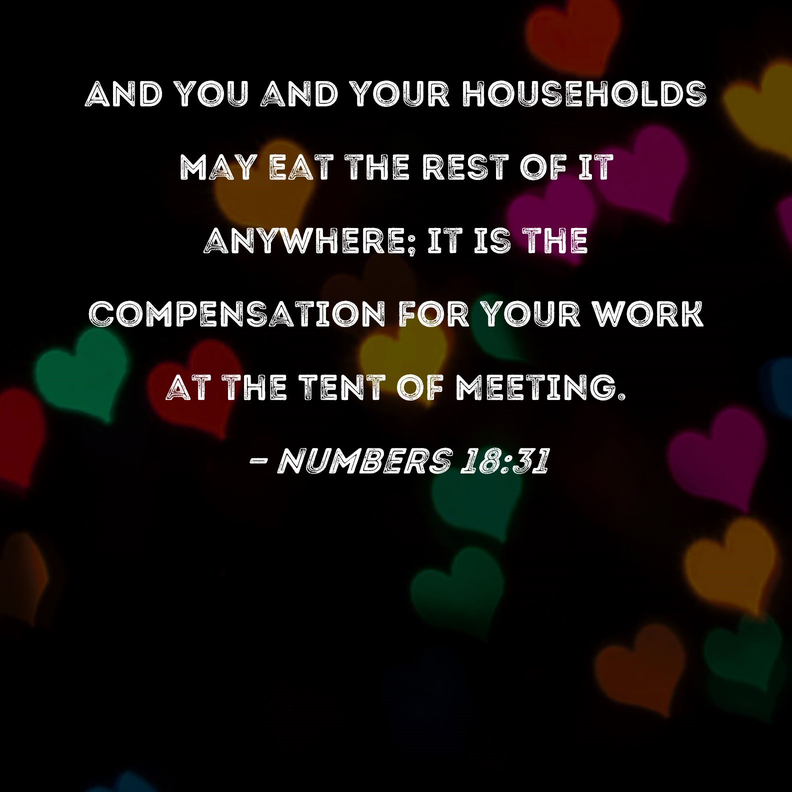 Numbers 18:31 And you and your households may eat the rest of it anywhere; it is the compensation for your work at the Tent of Meeting.