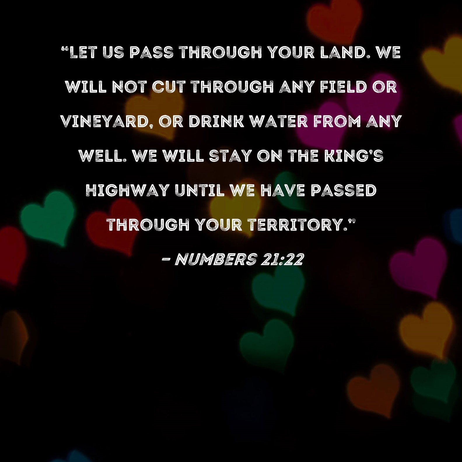Numbers 21:22 "Let us pass through your land. We will not cut through any field or vineyard, or drink water from any well. We will stay on the King's Highway until we have passed through your territory."