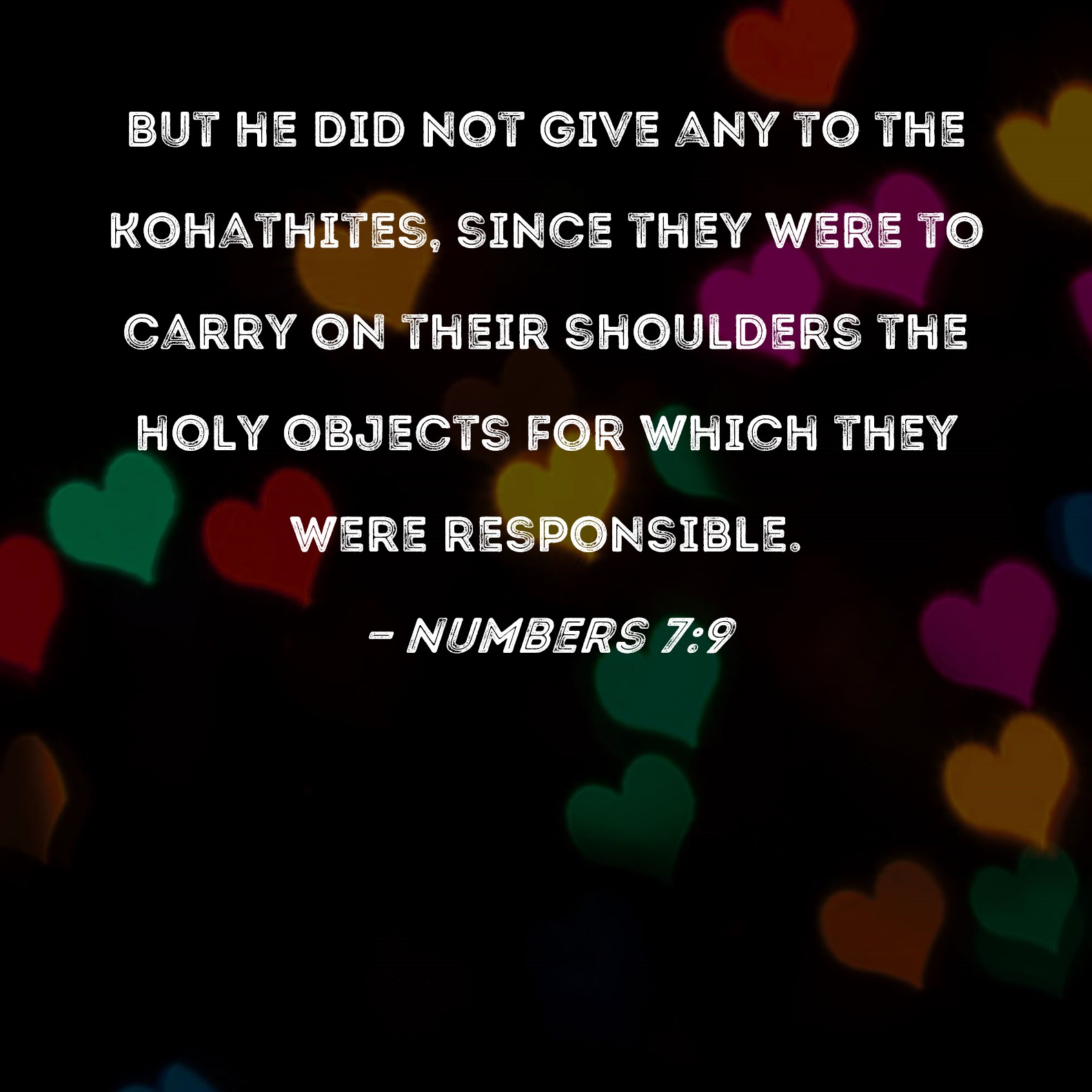 Numbers 7:9 But he did not give any to the Kohathites, since they were to carry on their shoulders the holy objects for which they were responsible.