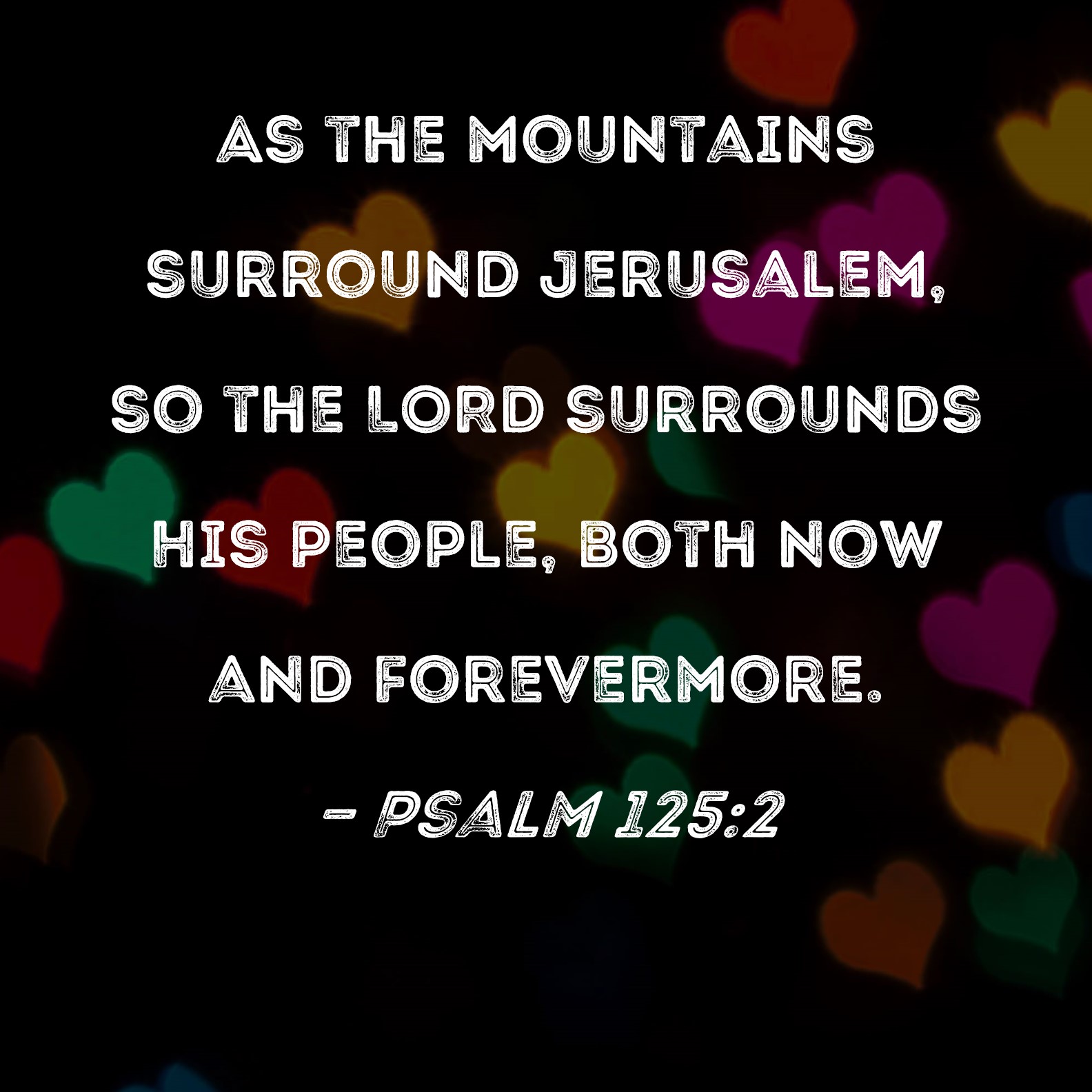 Psalm 125:2 As the mountains surround Jerusalem, so the LORD surrounds His people, both now and forevermore.