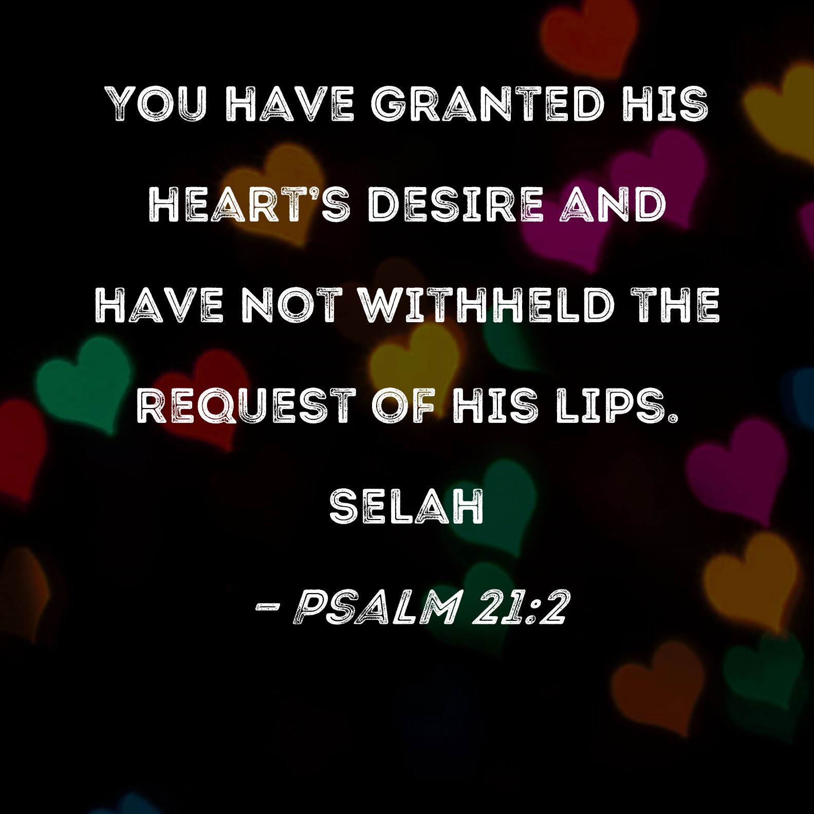 Psalm 21:2 You have granted his heart's desire and have not withheld the request of his lips. Selah
