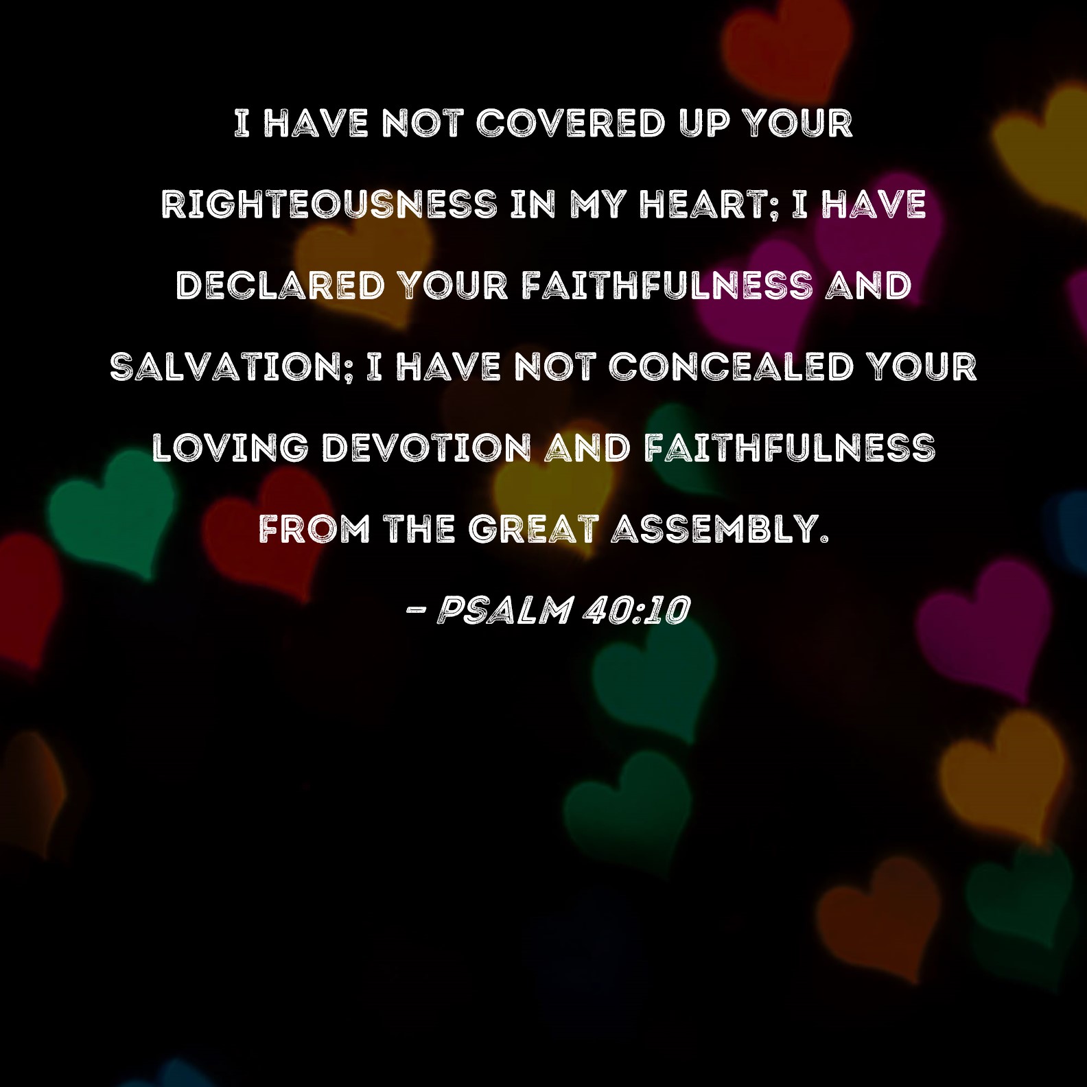 Psalm 40:10 I have not covered up Your righteousness in my heart; I have declared Your faithfulness and salvation; I have not concealed Your loving devotion and faithfulness from the great assembly.