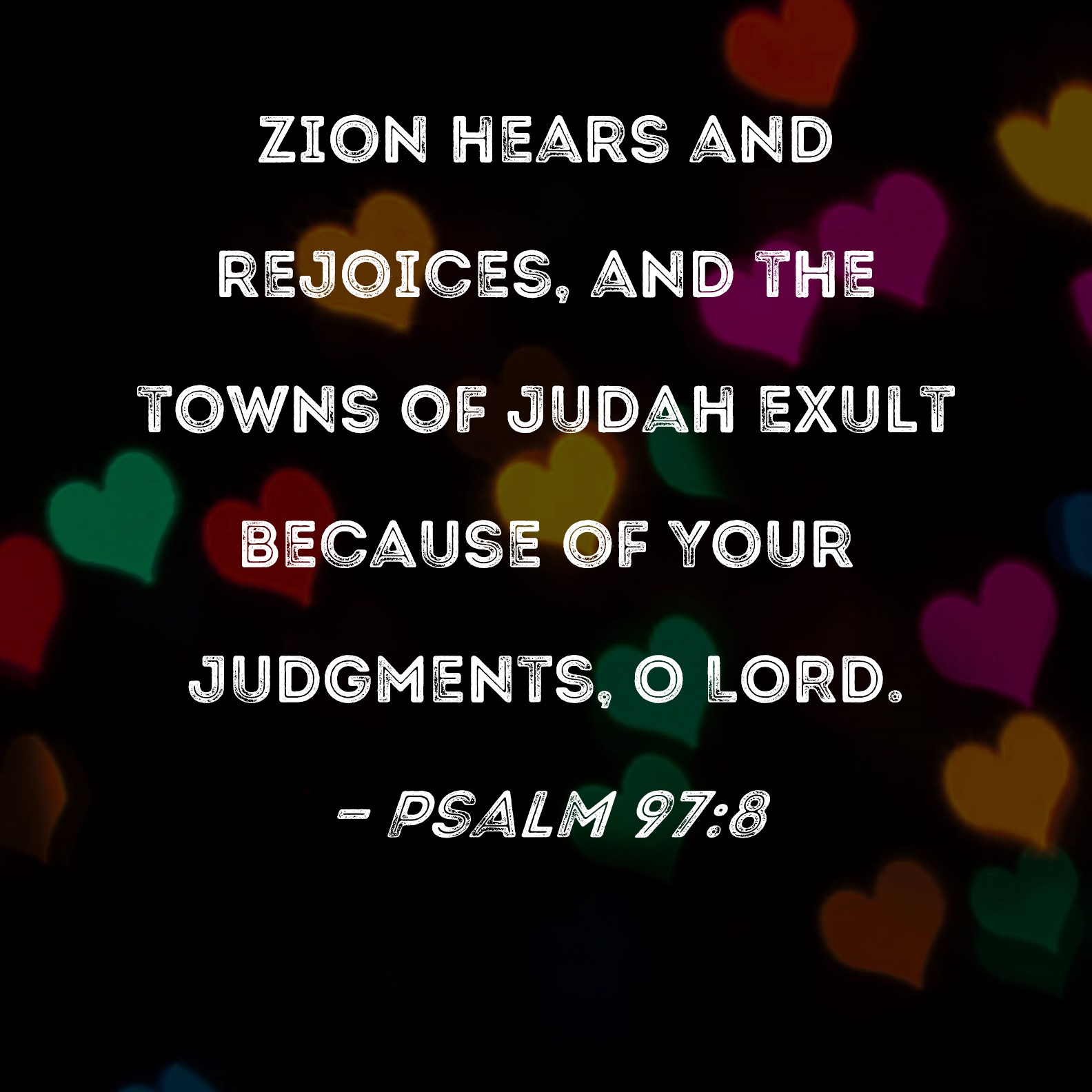 Psalm 97:8 Zion hears and rejoices, and the towns of Judah exult because of Your judgments, O LORD.