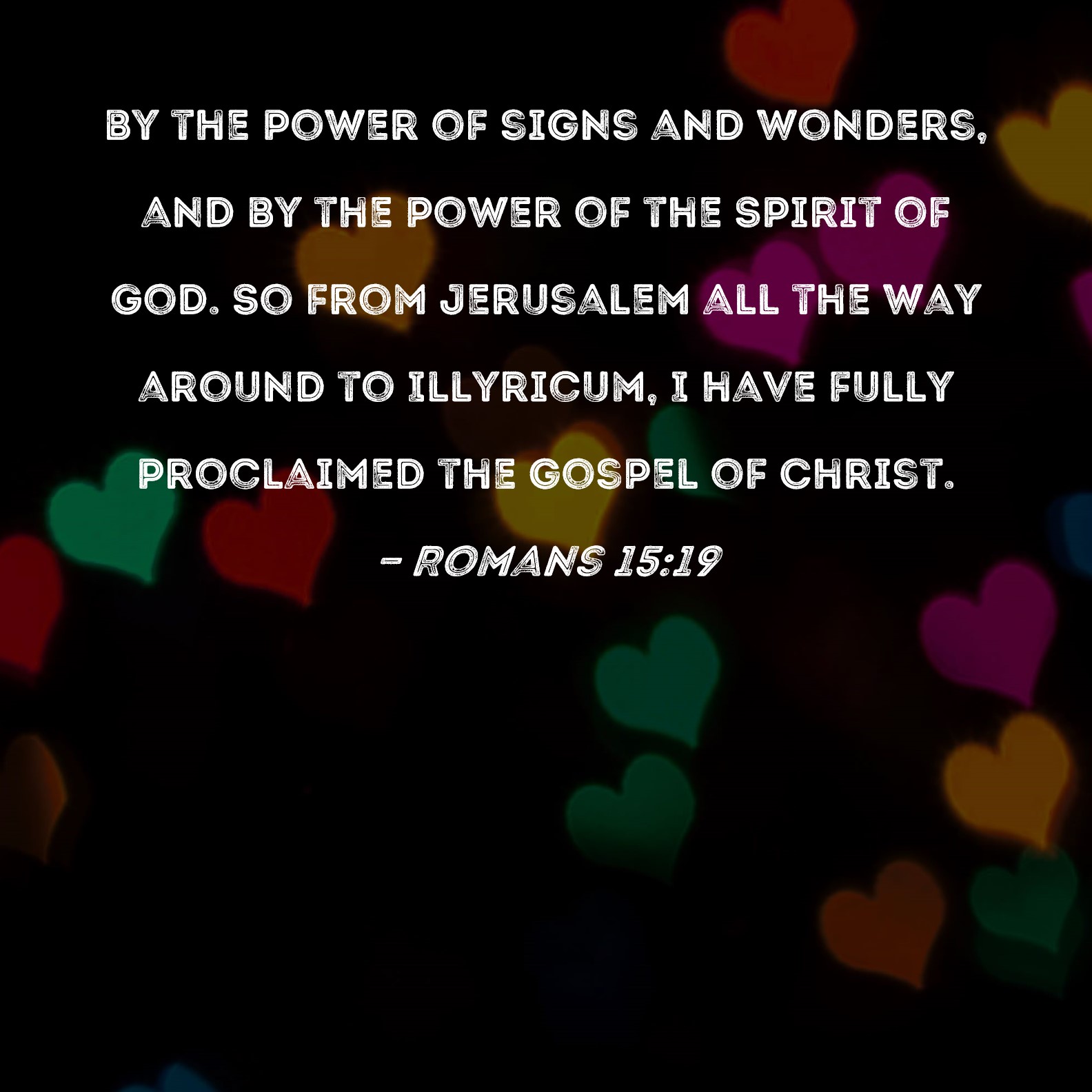 Romans 15:19 by the power of signs and wonders, and by the power of the Spirit of God. So from Jerusalem all the way around to Illyricum, I have fully proclaimed the gospel of Christ.