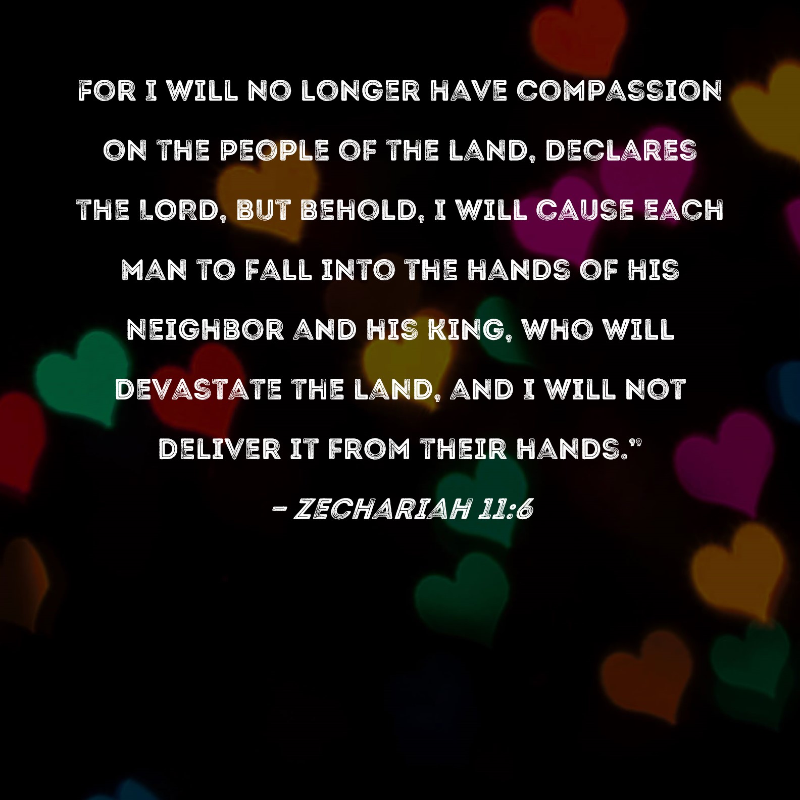 Zechariah 11:6 For I will no longer have compassion on the people of the land, declares the LORD, but behold, I will cause each man to fall into the hands of his neighbor and his king, who will devastate the land, and I will not deliver it from their hands."