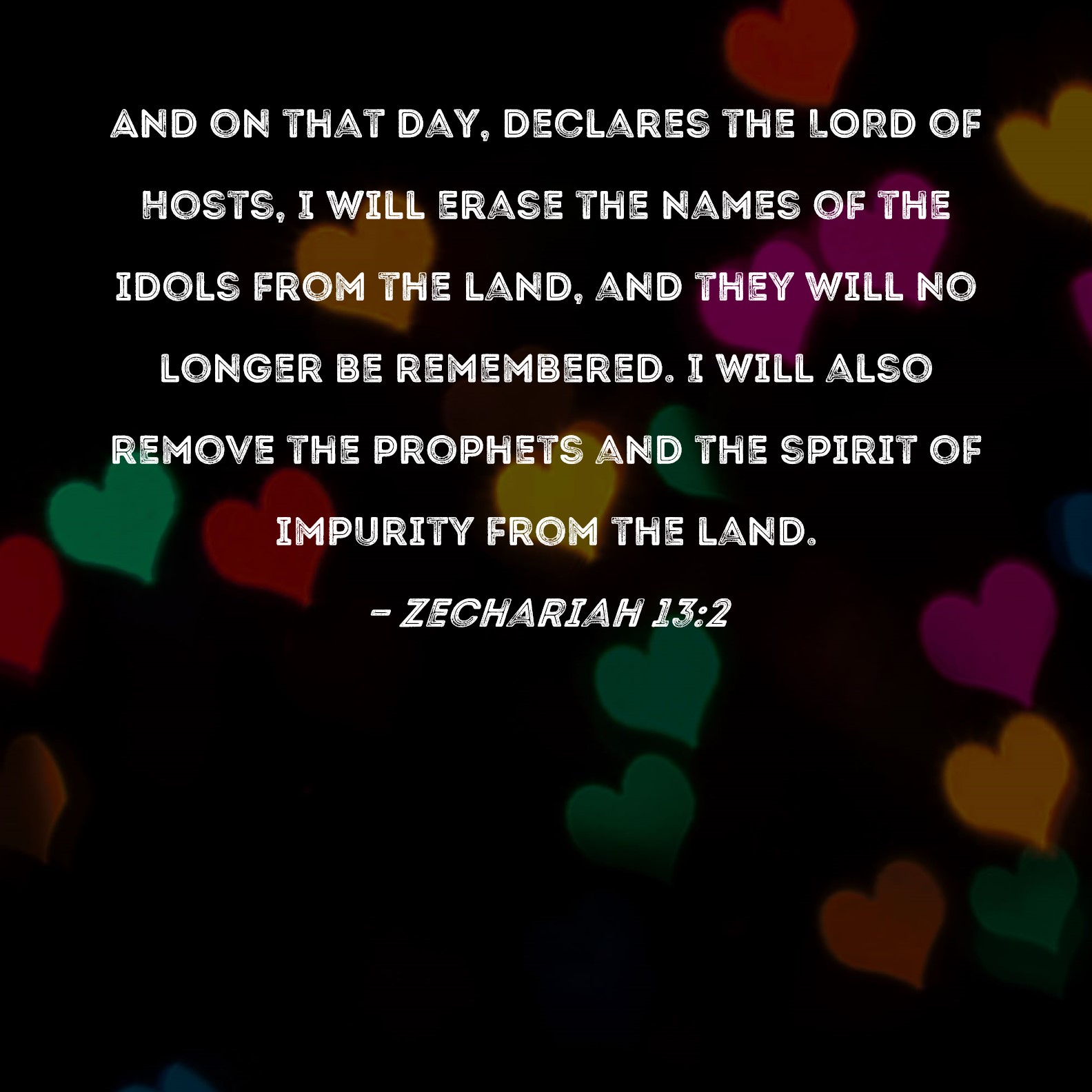 Zechariah 13:2 And on that day, declares the LORD of Hosts, I will erase the names of the idols from the land, and they will no longer be remembered. I will also remove the prophets and the spirit of impurity from the land.