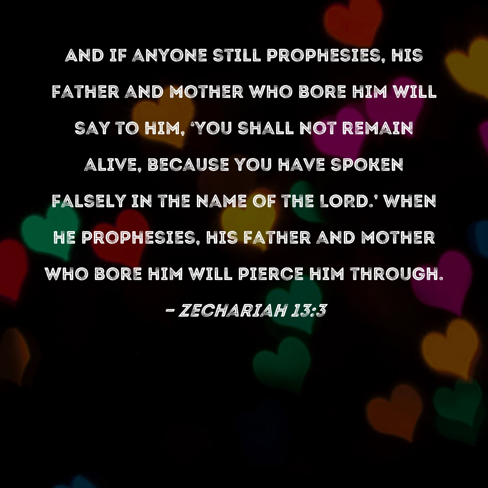 Zechariah 13:3 And if anyone still prophesies, his father and mother who bore him will say to him, 'You shall not remain alive, because you have spoken falsely in the name of the LORD.' When he prophesies, his father and mother who bore him will pierce him through.