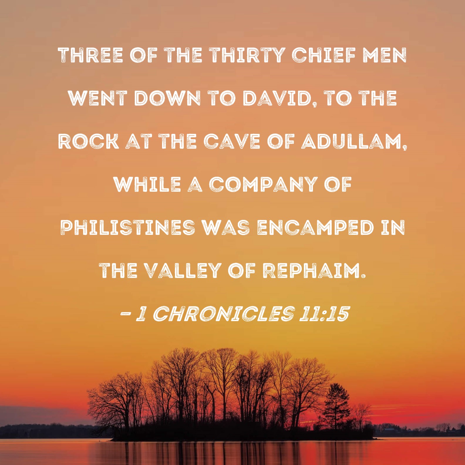 1 Chronicles 11:15 Three of the thirty chief men went down to David, to the rock at the cave of Adullam, while a company of Philistines was encamped in the Valley of Rephaim.