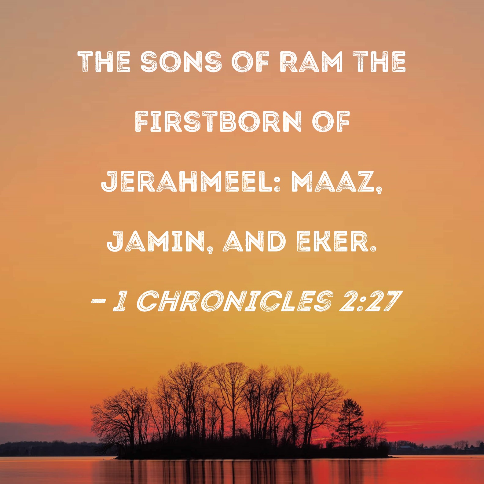 BSB: The sons of Ram the firstborn of Jerahmeel: Maaz, Jamin, and Eker. KJV: And the sons of Ram the firstborn of Jerahmeel were, Maaz, and Jamin, and Eker. DRB: And the sons of Ram the firstborn of Jerameel, were Moos, Jamin, and Achar. DBT: And the sons of Ram, the firstborn of Jerahmeel, were Maaz, and Jamin, and Eker. ERV: And the sons of Ram the firstborn of Jerahmeel were Maaz, and Jamin, and Eker. WBT: And the sons of Ram the first-born of Jerahmeel were, Maaz, and Jamin, and Eker. WEB: The sons of Ram the firstborn of Jerahmeel were Maaz, Jamin, and Eker. YLT: And sons of Ram, first-born of Jerahmeel, are Maaz, and Jamin, and Eker.Links 1 Chronicles 2:27 NIV • 1 Chronicles 2:27 NLT • 1 Chronicles 2:27 ESV • 1 Chronicles 2:27 NASB • 1 Chronicles 2:27 KJV • 1 Chronicles 2:27 Interlinear • 1 Chronicles 2:27 Commentaries • 1 Chronicles 2:27 Parallel Texts • 1 Chronicles 2:27 Bible Apps • 1 Chronicles 2:27 Parallel • Bible Hub |