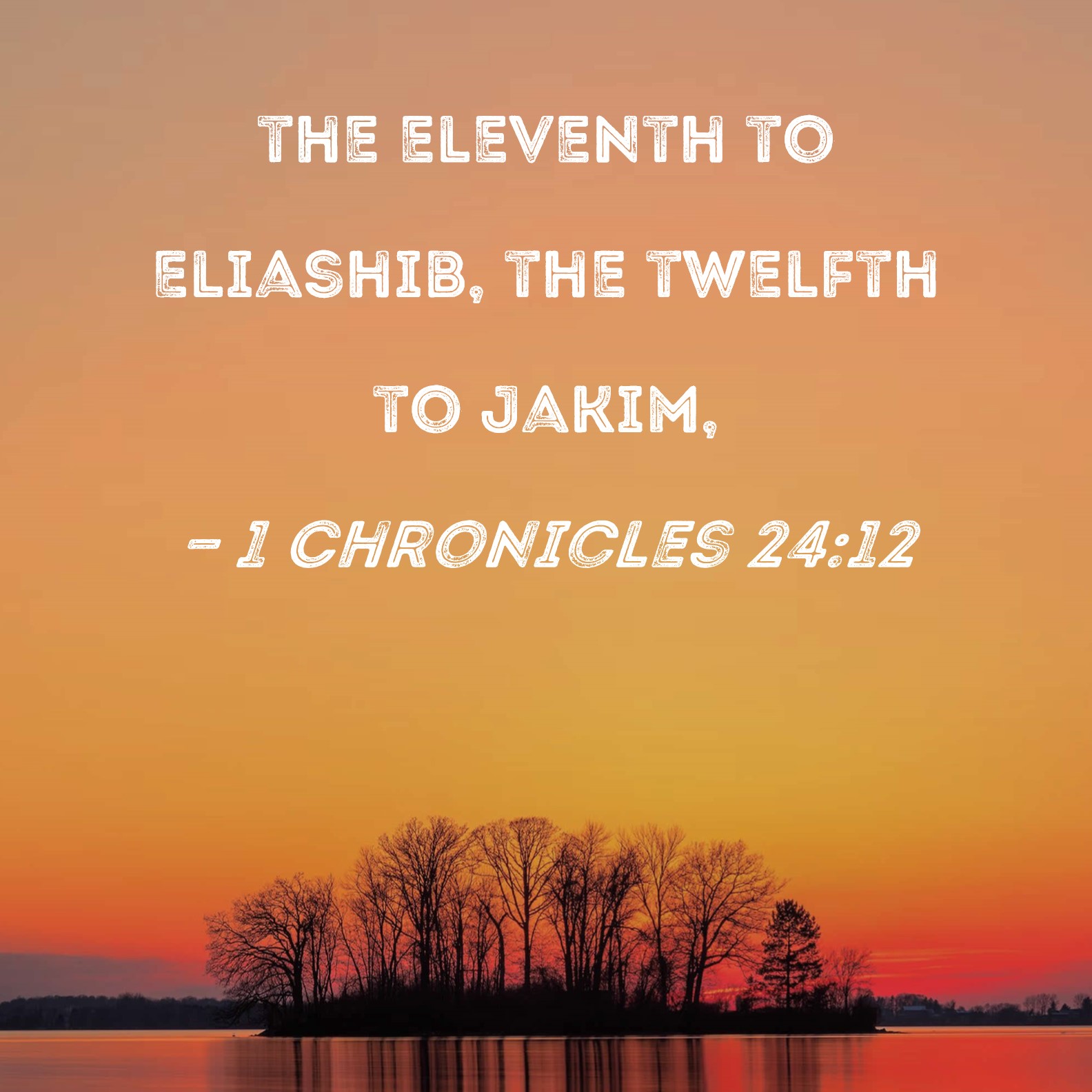 BSB: the eleventh to Eliashib, the twelfth to Jakim, KJV: The eleventh to Eliashib, the twelfth to Jakim, DRB: The eleventh to Eliasib, the twelfth to Jacim, DBT: the eleventh for Eliashib, the twelfth for Jakim, ERV: the eleventh to Eliashib, the twelfth to Jakim; WBT: The eleventh to Eliashib, the twelfth to Jakim, WEB: the eleventh to Eliashib, the twelfth to Jakim, YLT: for Eliashib the eleventh, for Jakim the twelfth,Links 1 Chronicles 24:12 NIV • 1 Chronicles 24:12 NLT • 1 Chronicles 24:12 ESV • 1 Chronicles 24:12 NASB • 1 Chronicles 24:12 KJV • 1 Chronicles 24:12 Interlinear • 1 Chronicles 24:12 Commentaries • 1 Chronicles 24:12 Parallel Texts • 1 Chronicles 24:12 Bible Apps • 1 Chronicles 24:12 Parallel • Bible Hub |