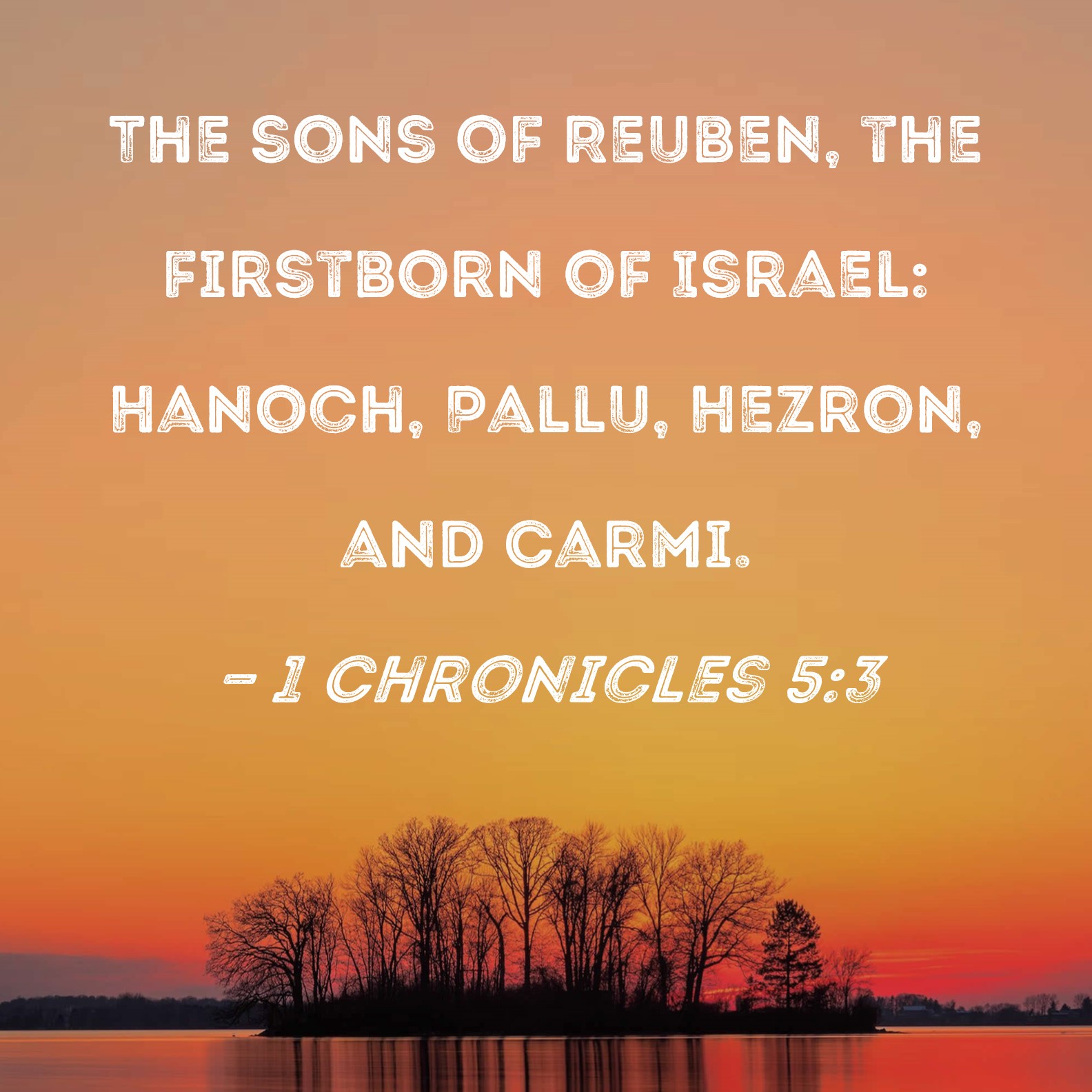BSB: The sons of Reuben, the firstborn of Israel: Hanoch, Pallu, Hezron, and Carmi. KJV: The sons, I say, of Reuben the firstborn of Israel were, Hanoch, and Pallu, Hezron, and Carmi. DRB: The sons then of Ruben the firstborn of Israel were Enoch, and Phallu, Esron, and Charmi. DBT: the sons of Reuben, the firstborn of Israel: Enoch And Phallu, Hezron And Carmi. ERV: the sons of Reuben the firstborn of Israel; Hanoch, and Pallu, Hezron, and Carmi. WBT: The sons, I say, of Reuben the first-born of Israel were, Hanoch, and Pallu, Hezron, and Carmi. WEB: the sons of Reuben the firstborn of Israel: Hanoch, Pallu, Hezron, and Carmi. YLT: Sons of Reuben, first-born of Israel: Hanoch, and Pallu, Hezron, and Carmi.Links 1 Chronicles 5:3 NIV • 1 Chronicles 5:3 NLT • 1 Chronicles 5:3 ESV • 1 Chronicles 5:3 NASB • 1 Chronicles 5:3 KJV • 1 Chronicles 5:3 Interlinear • 1 Chronicles 5:3 Commentaries • 1 Chronicles 5:3 Parallel Texts • 1 Chronicles 5:3 Bible Apps • 1 Chronicles 5:3 Parallel • Bible Hub |