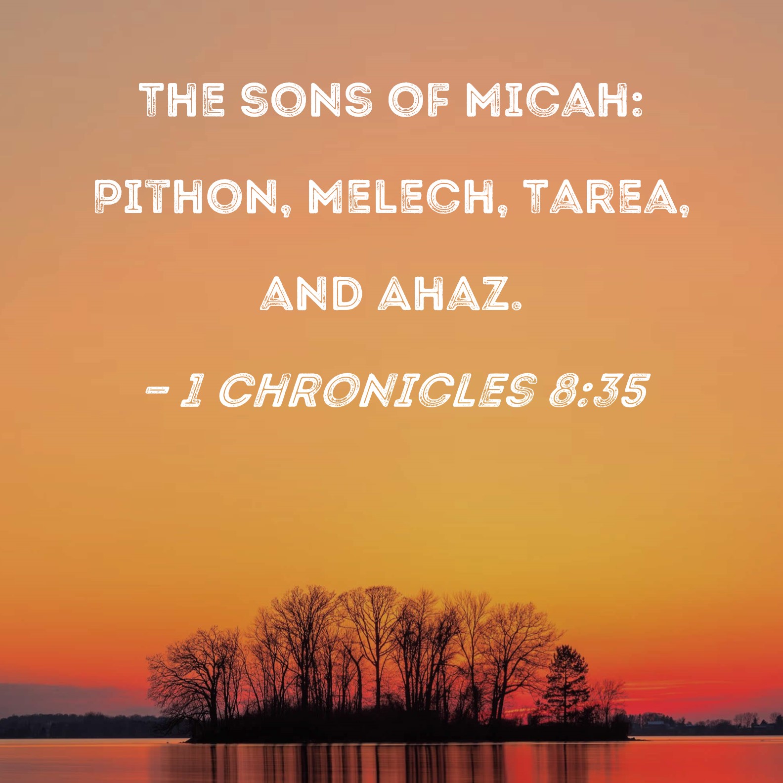 BSB: The sons of Micah: Pithon, Melech, Tarea, and Ahaz. KJV: And the sons of Micah were, Pithon, and Melech, and Tarea, and Ahaz. DRB: And the sons of Micha were Phithon, and Melech, and Tharaa, and Ahaz. DBT: And the sons of Micah: Pithon, and Melech, and Tarea, and Ahaz. ERV: And the sons of Micah; Pithon, and Melech, and Tarea, and Ahaz. WBT: And the sons of Micah were, Pithon, and Melech, and Tarea, and Ahaz. WEB: The sons of Micah: Pithon, Melech, Tarea, and Ahaz. YLT: and sons of Micah: Pithon, and Melech, and Tarea, and Ahaz:Links 1 Chronicles 8:35 NIV • 1 Chronicles 8:35 NLT • 1 Chronicles 8:35 ESV • 1 Chronicles 8:35 NASB • 1 Chronicles 8:35 KJV • 1 Chronicles 8:35 Interlinear • 1 Chronicles 8:35 Commentaries • 1 Chronicles 8:35 Parallel Texts • 1 Chronicles 8:35 Bible Apps • 1 Chronicles 8:35 Parallel • Bible Hub |