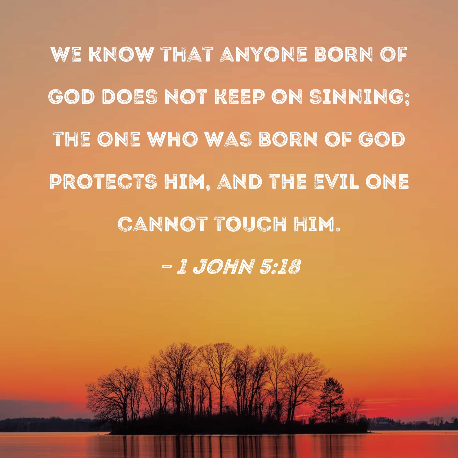 BSB: We know that anyone born of God does not keep on sinning; the One who was born of God protects him, and the evil one cannot touch him. KJV: We know that whosoever is born of God sinneth not; but he that is begotten of God keepeth himself, and that wicked one toucheth him not. DRB: We know that whosoever is born of God, sinneth not: but the generation of God preserveth him, and the wicked one toucheth him not. DBT: We know that every one begotten of God does not sin, but he that has been begotten of God keeps himself, and the wicked one does not touch him. ERV: We know that whosoever is begotten of God sinneth not; but he that was begotten of God keepeth him, and the evil one toucheth him not. WBT: We know that whoever is born of God, sinneth not; but he that is begotten of God, keepeth himself, and that wicked one toucheth him not. WEB: We know that whoever is born of God doesn’t sin, but he who was born of God keeps himself, and the evil one doesn’t touch him. YLT: We have known that every one who hath been begotten of God doth not sin, but he who was begotten of God doth keep himself, and the evil one doth not touch him;Links 1 John 5:18 NIV • 1 John 5:18 NLT • 1 John 5:18 ESV • 1 John 5:18 NASB • 1 John 5:18 KJV • 1 John 5:18 Interlinear • 1 John 5:18 Commentaries • 1 John 5:18 Parallel Texts • 1 John 5:18 Bible Apps • 1 John 5:18 Parallel • Bible Hub |
