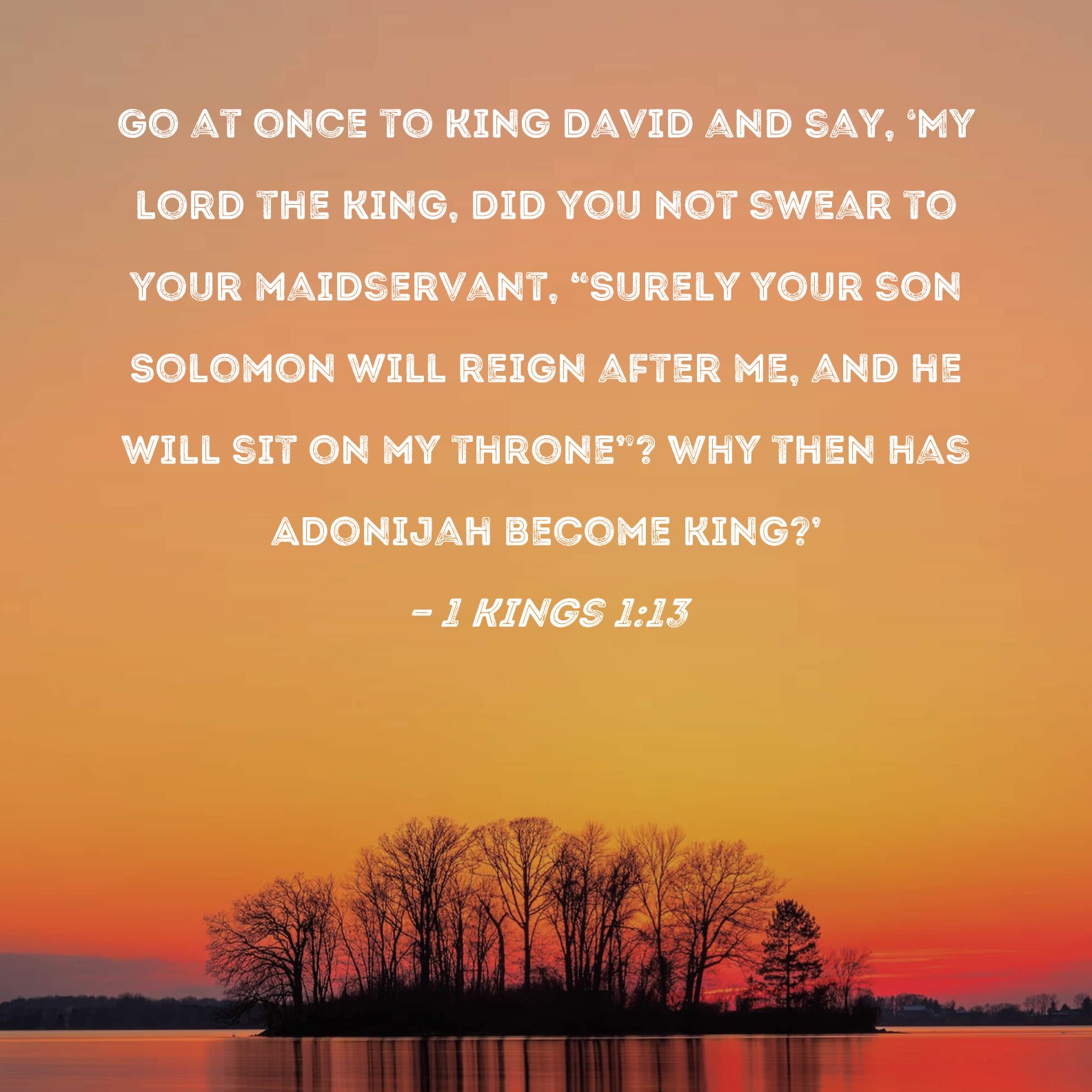 1 Kings 1:13 Go at once to King David and say, 'My lord the king, did you not swear to your maidservant, "Surely your son Solomon will reign after me, and he will sit on my throne"? Why then has Adonijah become king?'