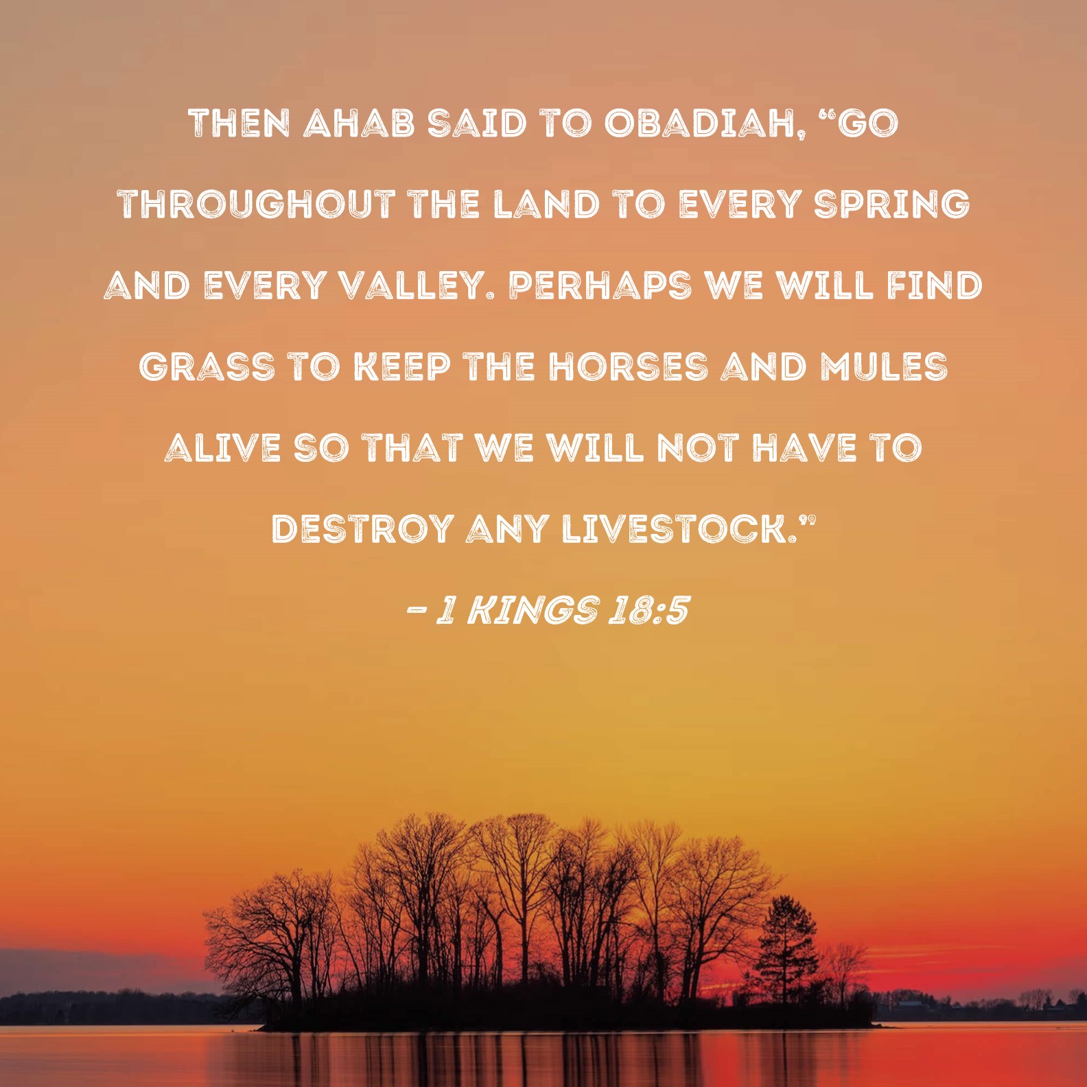 1 Kings 18:5 Then Ahab said to Obadiah, "Go throughout the land to every spring and every valley. Perhaps we will find grass to keep the horses and mules alive so that we will not have to destroy any livestock."