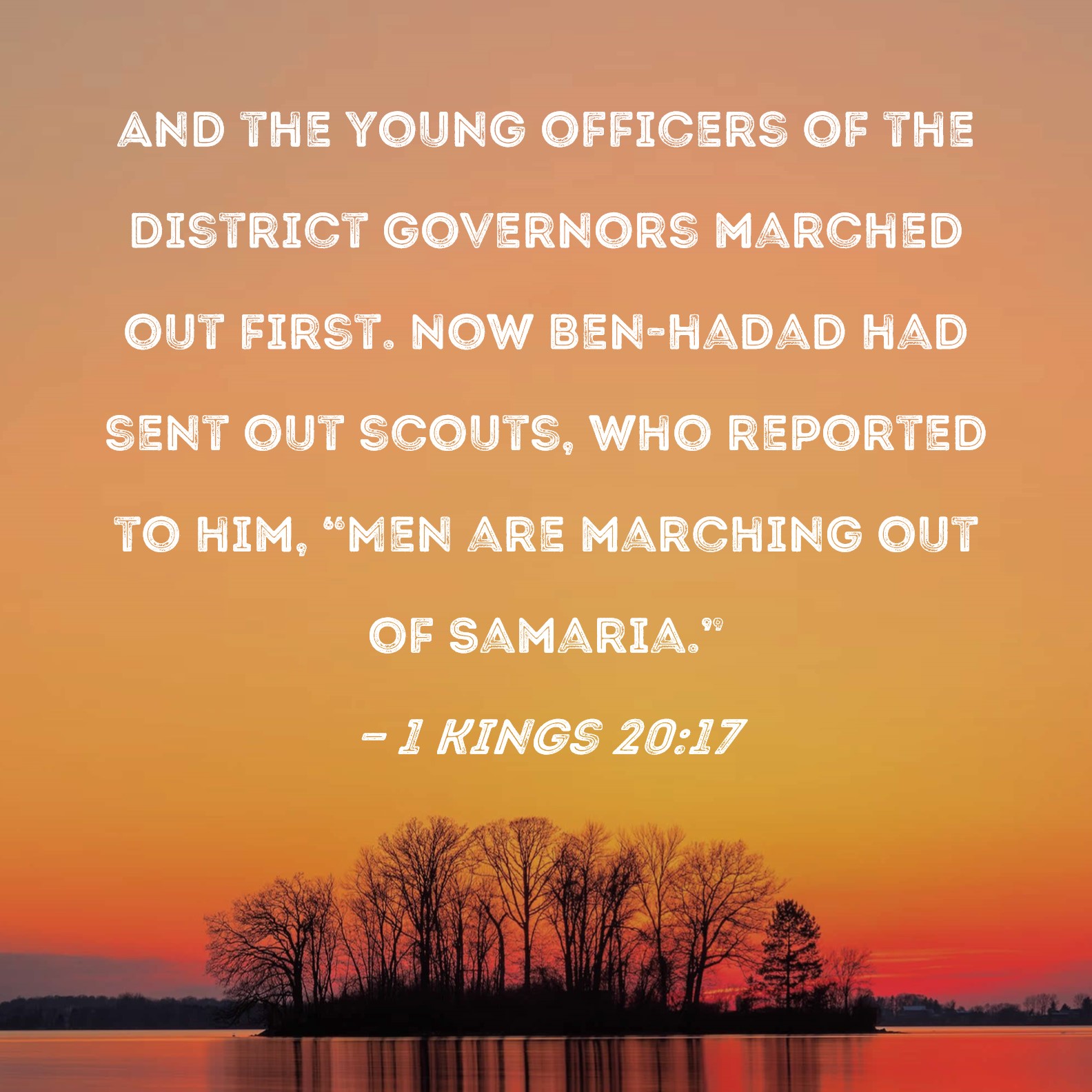 1 Kings 20:17 And the young officers of the district governors marched out first. Now Ben-hadad had sent out scouts, who reported to him, "Men are marching out of Samaria."