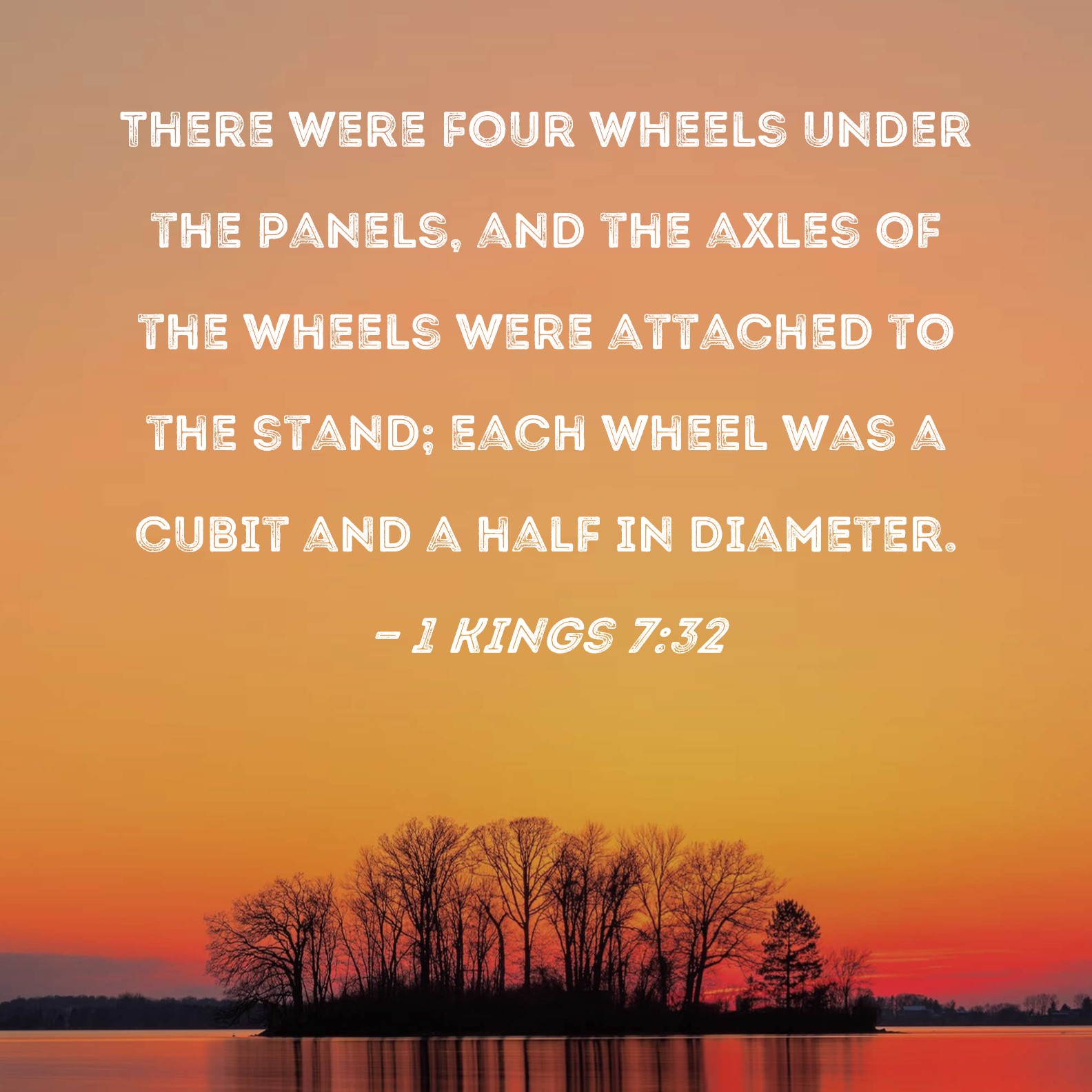 1 Kings 7:32 There were four wheels under the panels, and the axles of the wheels were attached to the stand; each wheel was a cubit and a half in diameter.