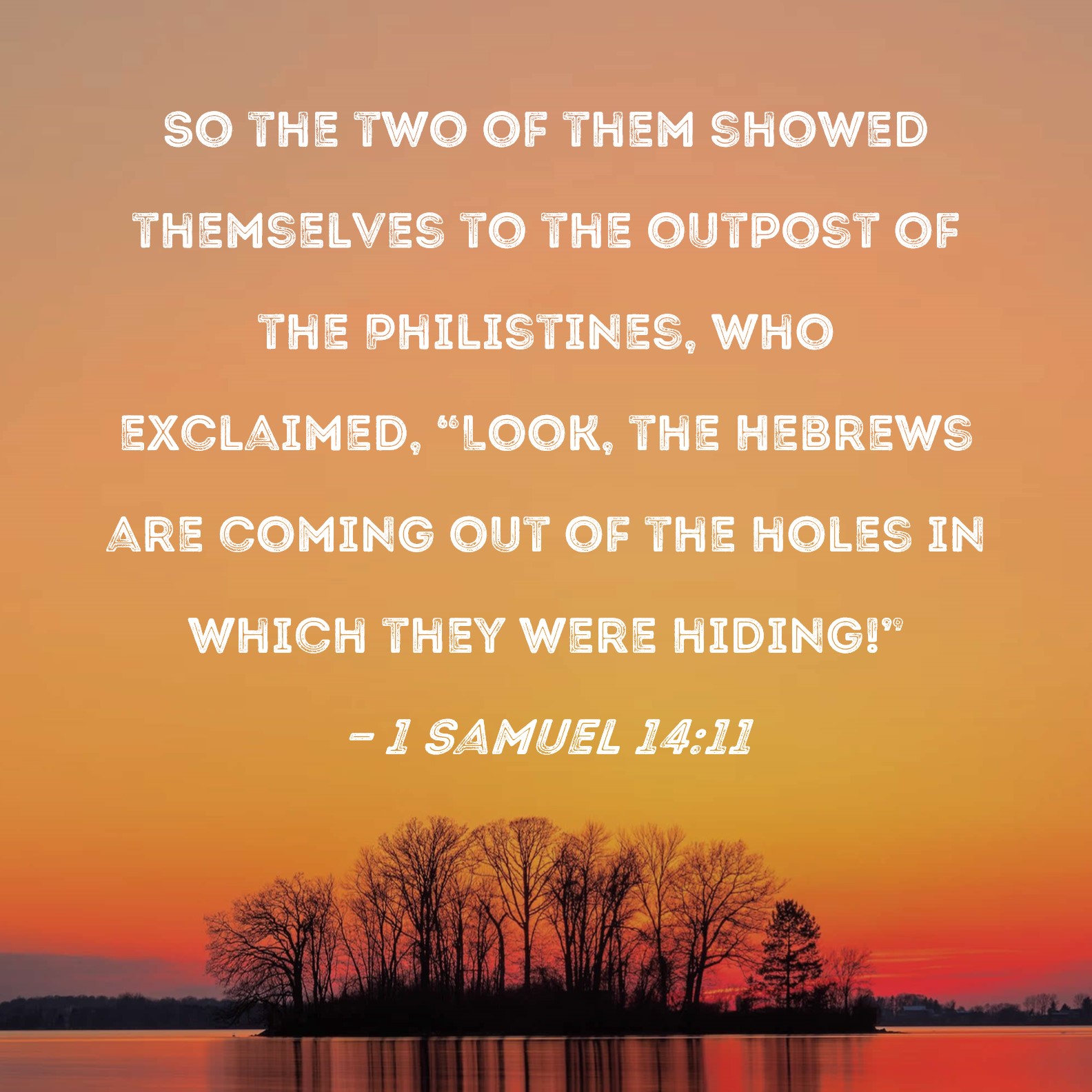 1 Samuel 14:11 So the two of them showed themselves to the outpost of the Philistines, who exclaimed, "Look, the Hebrews are coming out of the holes in which they were hiding!"