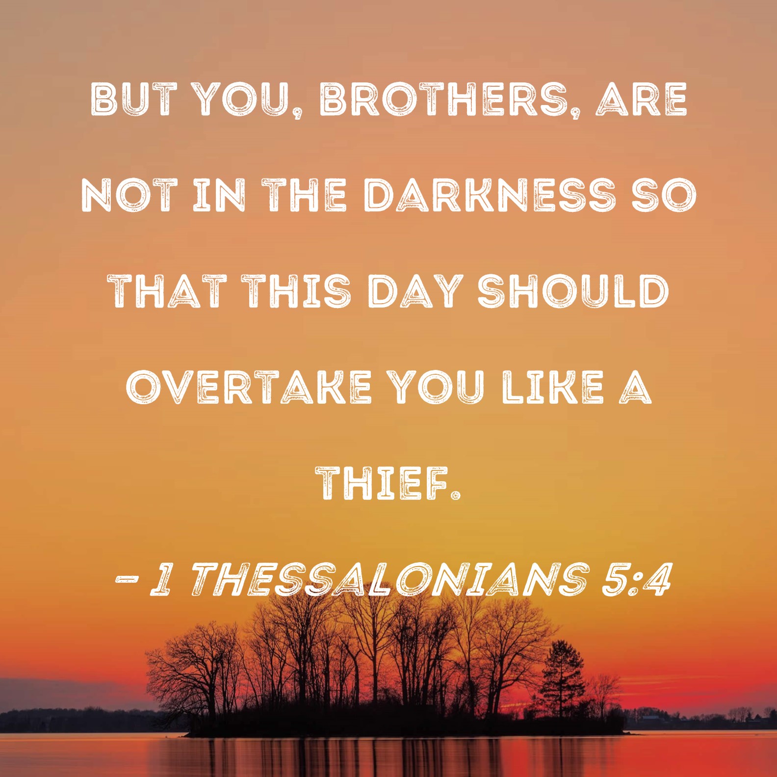 BSB: But you, brothers, are not in the darkness so that this day should overtake you like a thief. KJV: But ye, brethren, are not in darkness, that that day should overtake you as a thief. DRB: But you, brethren, are not in darkness, that that day should overtake you as a thief. DBT: But ye, brethren, are not in darkness, that the day should overtake you as a thief: ERV: But ye, brethren, are not in darkness, that that day should overtake you as a thief: WBT: But ye, brethren, are not in darkness, that that day should overtake you as a thief. WEB: But you, brothers, aren’t in darkness, that the day should overtake you like a thief. YLT: and ye, brethren, are not in darkness, that the day may catch you as a thief;Links 1 Thessalonians 5:4 NIV • 1 Thessalonians 5:4 NLT • 1 Thessalonians 5:4 ESV • 1 Thessalonians 5:4 NASB • 1 Thessalonians 5:4 KJV • 1 Thessalonians 5:4 Interlinear • 1 Thessalonians 5:4 Commentaries • 1 Thessalonians 5:4 Parallel Texts • 1 Thessalonians 5:4 Bible Apps • 1 Thessalonians 5:4 Parallel • Bible Hub |