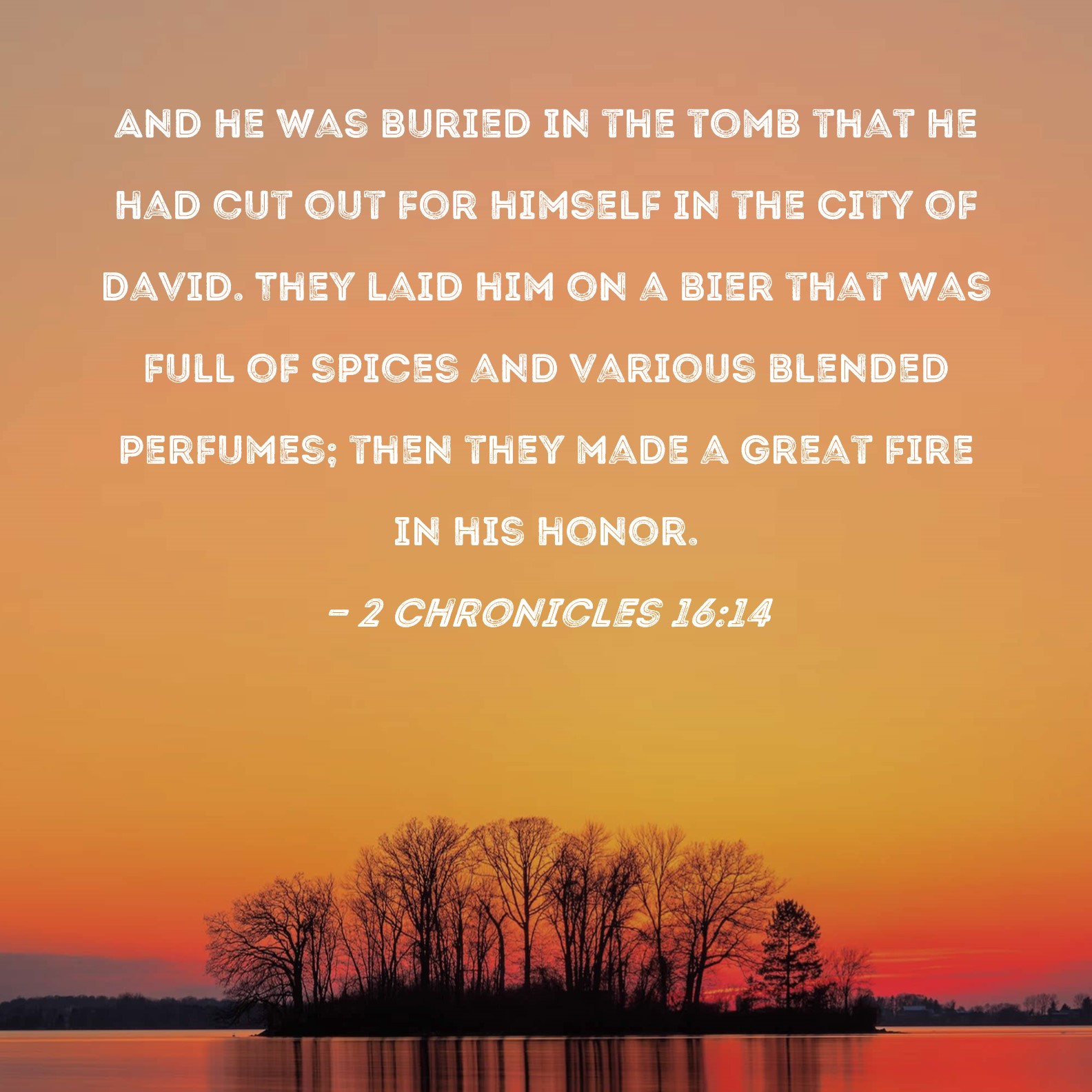 2 Chronicles 16:14 And he was buried in the tomb that he had cut out for himself in the City of David. They laid him on a bier that was full of spices and various blended perfumes; then they made a great fire in his honor.