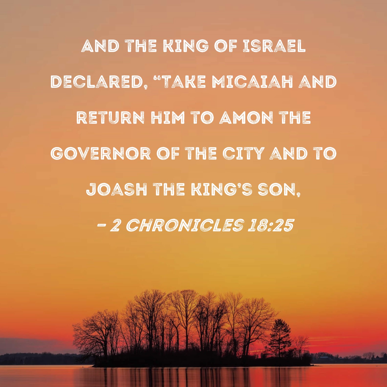 2 Chronicles 18:25 And the king of Israel declared, "Take Micaiah and return him to Amon the governor of the city and to Joash the king's son,
