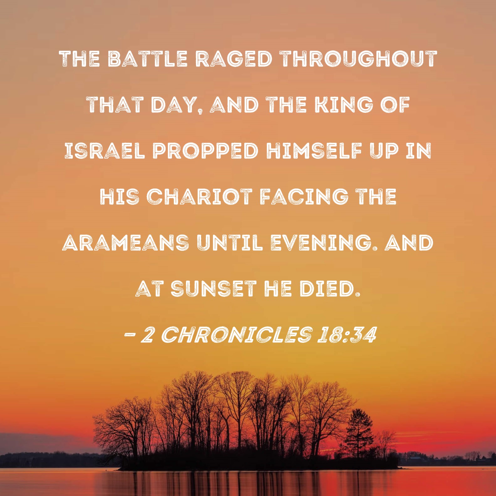 2 Chronicles 18:34 The battle raged throughout that day, and the king of Israel propped himself up in his chariot facing the Arameans until evening. And at sunset he died.