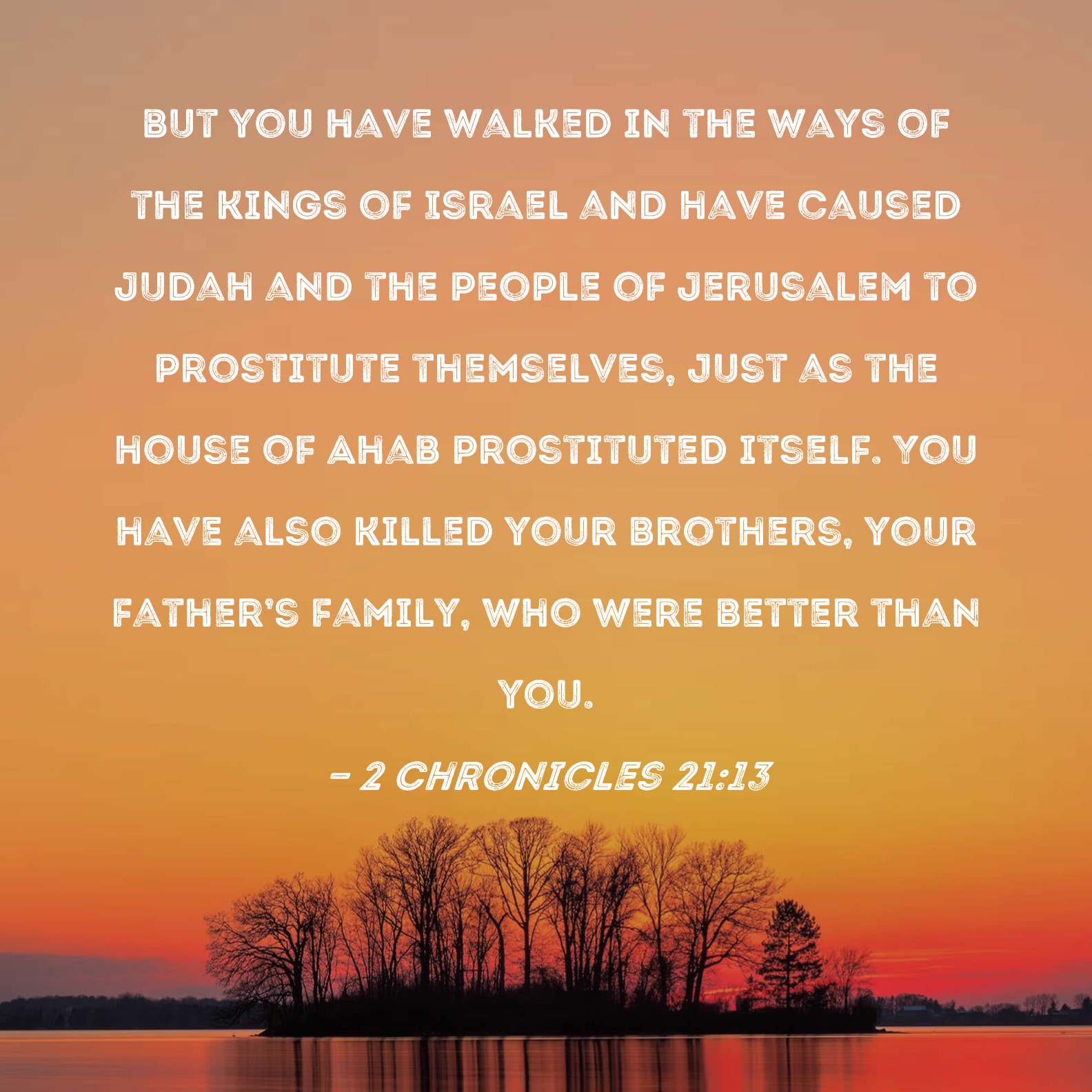 2 Chronicles 21:13 but you have walked in the ways of the kings of Israel and have caused Judah and the people of Jerusalem to prostitute themselves, just as the house of Ahab prostituted itself. You have also killed your brothers, your father's family, who were better than you.