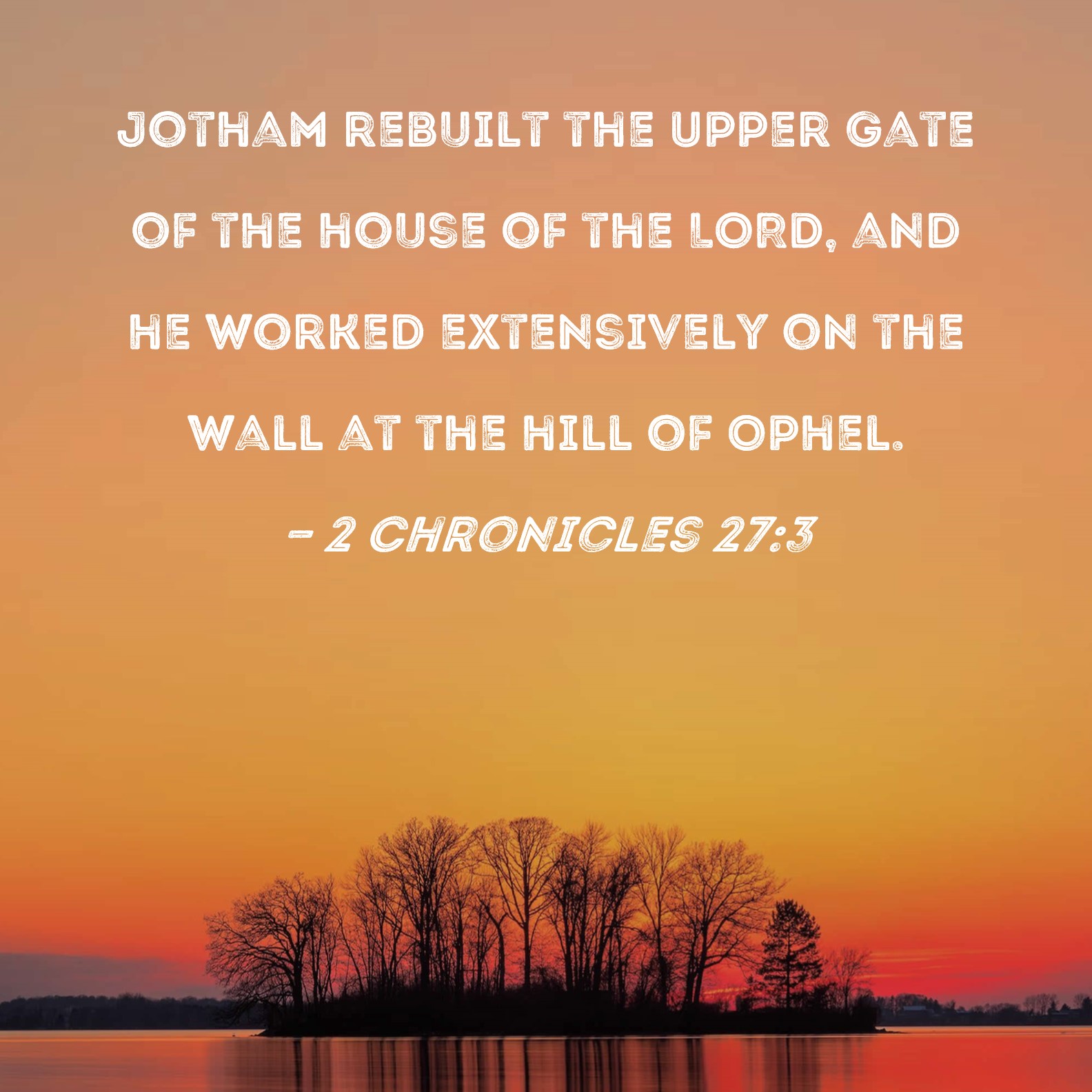 2 Chronicles 27:3 Jotham rebuilt the Upper Gate of the house of the LORD, and he worked extensively on the wall at the hill of Ophel.